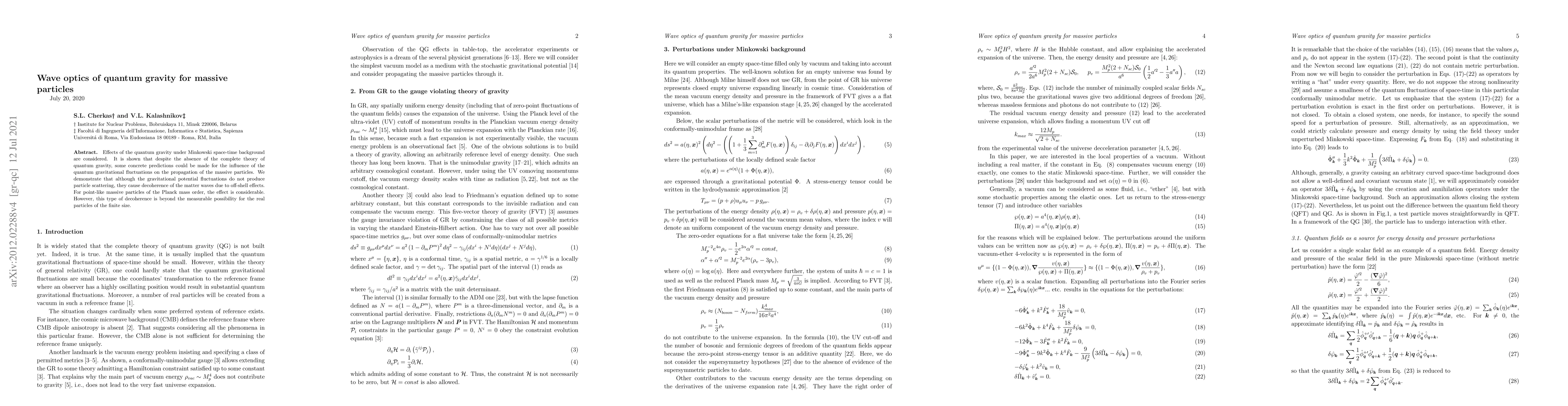 Effects of the quantum gravity under Minkowski space-time background are considered. It is shown that despite the absence of the complete theory of quantum gravity, some concrete predictions could be made for the influence of the quantum gravitational fluctuations on the propagation of the massive particles. We demonstrate that although the gravitational potential fluctuations do not produce particle scattering, they cause decoherence of the matter waves due to off-shell effects. For point-like massive particles of the Planck mass order, the effect is considerable. However, this type of decoherence is beyond the measurable possibility for the real particles of the finite size.