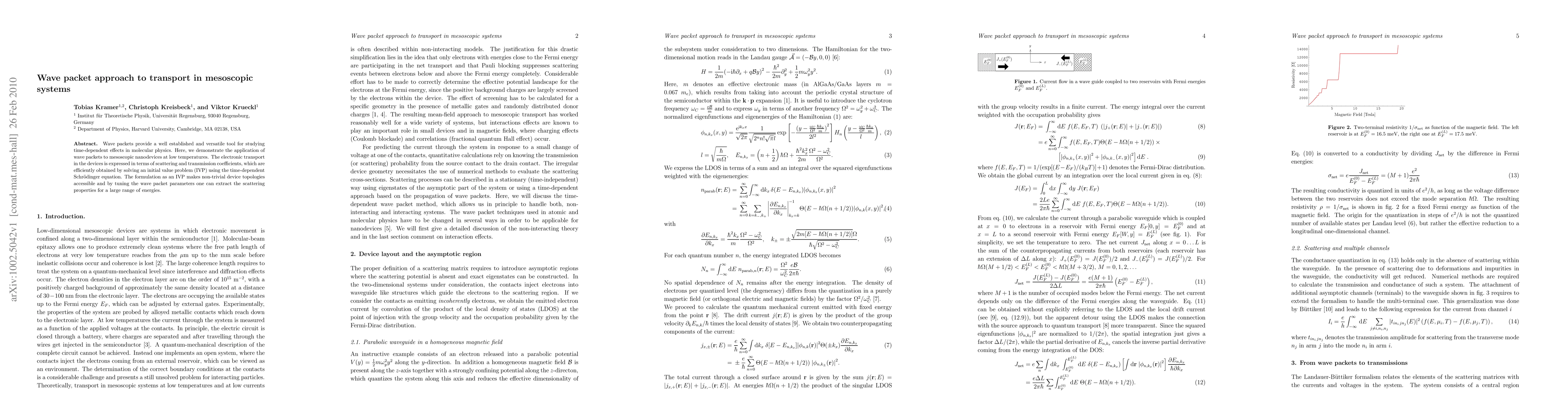 This paper applies wave packet methods to study electronic transport in mesoscopic nanodevices at low temperatures, solving the time-dependent Schrödinger equation as an initial value problem to obtain scattering and transmission coefficients. The approach allows for analysis of complex device topologies and extraction of scattering properties across a broad energy range.
