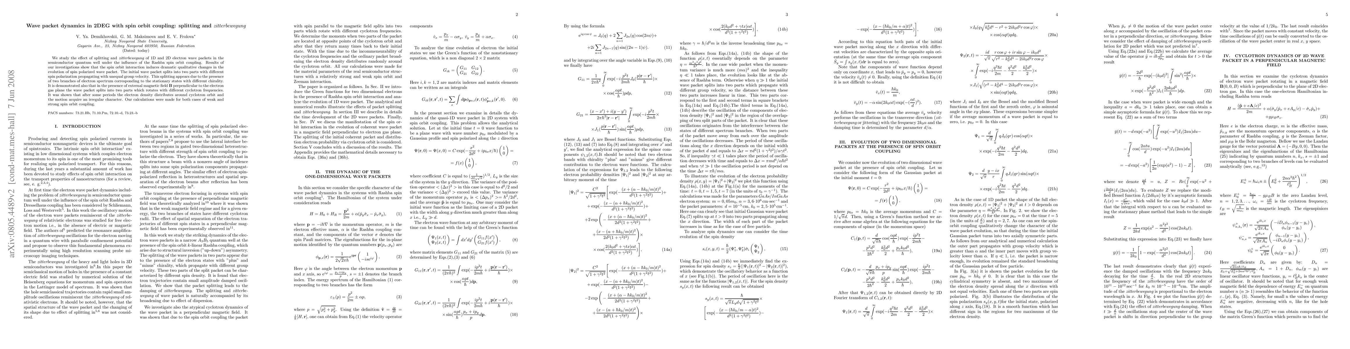 We study the effect of splitting and zitterbewegung of 1D and 2D electron wave packets in the semiconductor quantum well under the influence of the Rashba spin orbit coupling. Results of our investigations show that the spin orbit interaction induces dramatic qualitative changes in the evolution of spin polarized wave packet. The initial wave packet splits into two parts with different spin polarization propagating with unequal group velocity. This splitting appears due to the presence of two branches of electron spectrum corresponding to the stationary states with different chirality. It is demonstrated also that in the presence of external magnetic field B$ perpendicular to the electron gas plane the wave packet splits into two parts which rotates with different cyclotron frequencies. It was shown that after some periods the electron density distributes around cyclotron orbit and the motion acquire an irregular character. Our calculations were made for both cases of weak and strong spin orbit coupling.