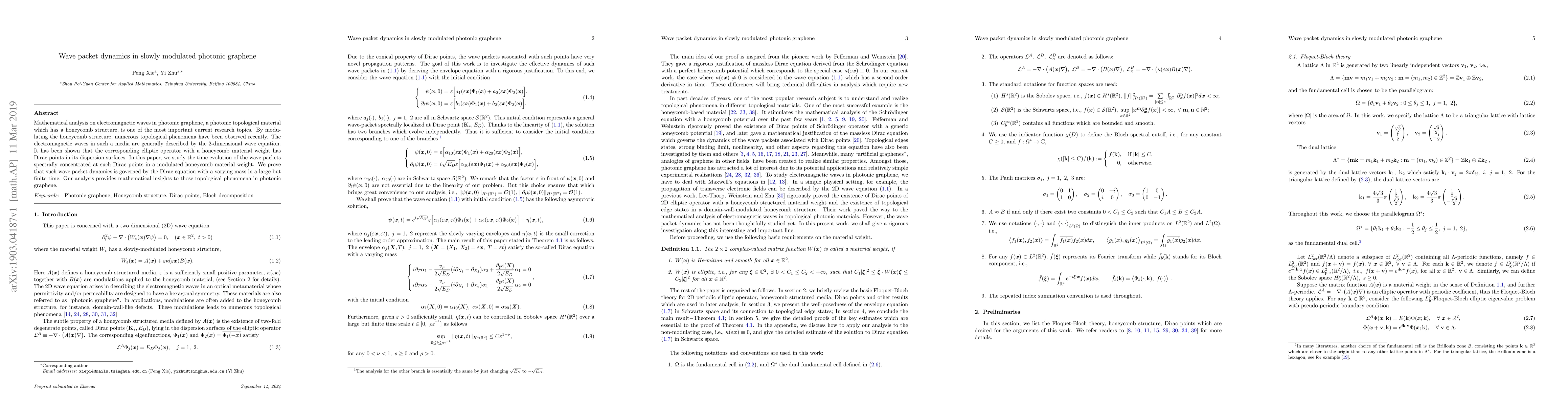 This paper investigates the time evolution of wave packets in photonic graphene with a modulated honeycomb structure, demonstrating that their dynamics are governed by a Dirac equation with a varying mass over a large but finite time period. The study provides mathematical insights into topological phenomena observed in this photonic topological material.