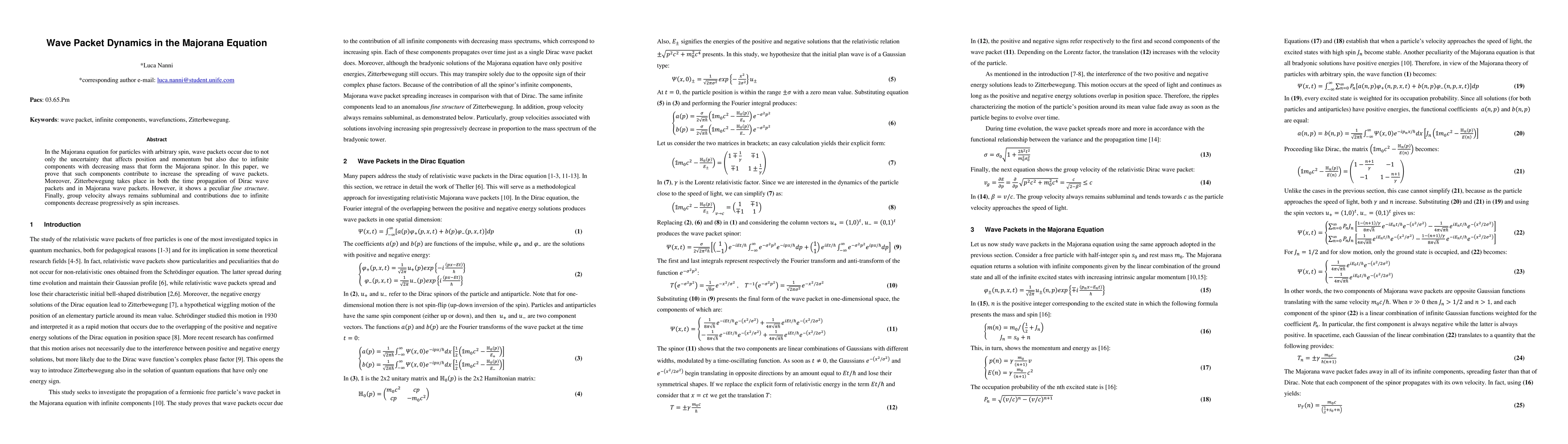 In the Majorana equation for particles with arbitrary spin, wave packets occur due to not only the uncertainty that affects position and momentum but also due to infinite components with decreasing mass that form the Majorana spinor. In this paper, we prove that such components contribute to increase the spreading of wave packets. Moreover, Zitterbewegung takes place in both the time propagation of Dirac wave packets and in Majorana wave packets. However, it shows a peculiar fine structure. Finally, group velocity always remains subluminal and contributions due to infinite components decrease progressively as spin increases.