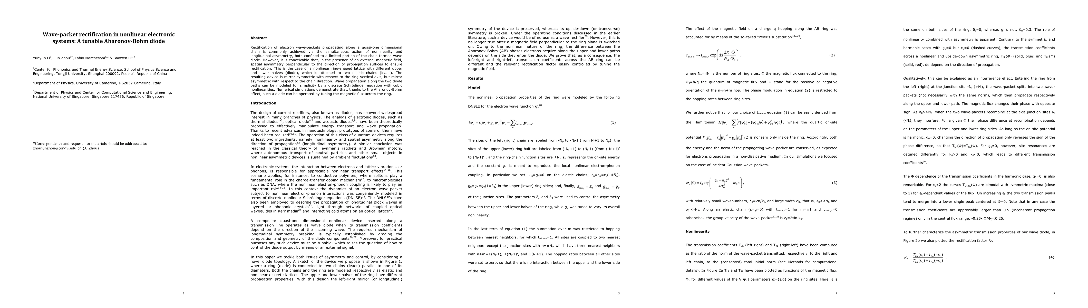 Rectification of electron wave-packets propagating along a quasi-one dimensional chain is commonly achieved via the simultaneous action of nonlinearity and longitudinal asymmetry, both confined to a limited portion of the chain termed wave diode. However, it is conceivable that, in the presence of an external magnetic field, spatial asymmetry perpendicular to the direction of propagation suffices to ensure rectification. This is the case of a nonlinear ring-shaped lattice with different upper and lower halves (diode), which is attached to two elastic chains (leads). The resulting device is mirror symmetric with respect to the ring vertical axis, but mirror asymmetric with respect to the chain direction. Wave propagation along the two diode paths can be modeled for simplicity by a discrete Schr\"odinger equation with cubic nonlinearities. Numerical simulations demonstrate that, thanks to the Aharonov-Bohm effect, such a diode can be operated by tuning the magnetic flux across the ring.