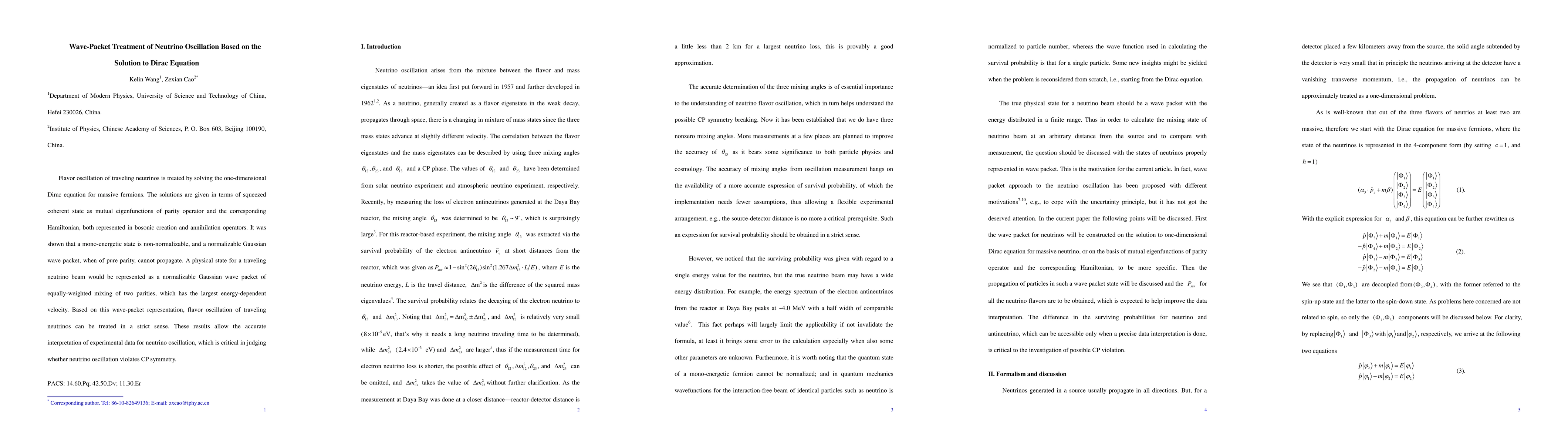 This paper solves the Dirac equation for massive neutrinos to describe flavor oscillation using squeezed coherent states. It concludes that a normalizable Gaussian wave packet representing a neutrino beam must mix two parities to propagate and oscillate accurately, which is essential for interpreting experimental data on CP symmetry violation.