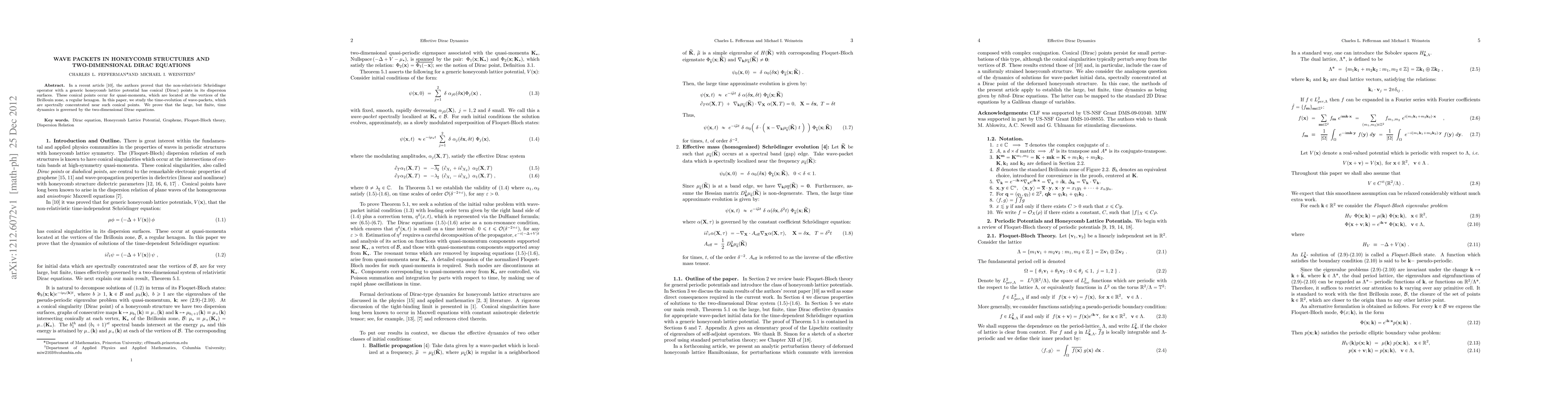 The research employs a mathematical analysis of wave packets in honeycomb structures, utilizing the non-relativistic Schrödinger operator with a generic honeycomb lattice potential, and proving the existence of conical (Dirac) points in the dispersion surfaces. The study examines the time-evolution of wave-packets concentrated near these conical points, demonstrating that large time dynamics are governed by two-dimensional Dirac equations.