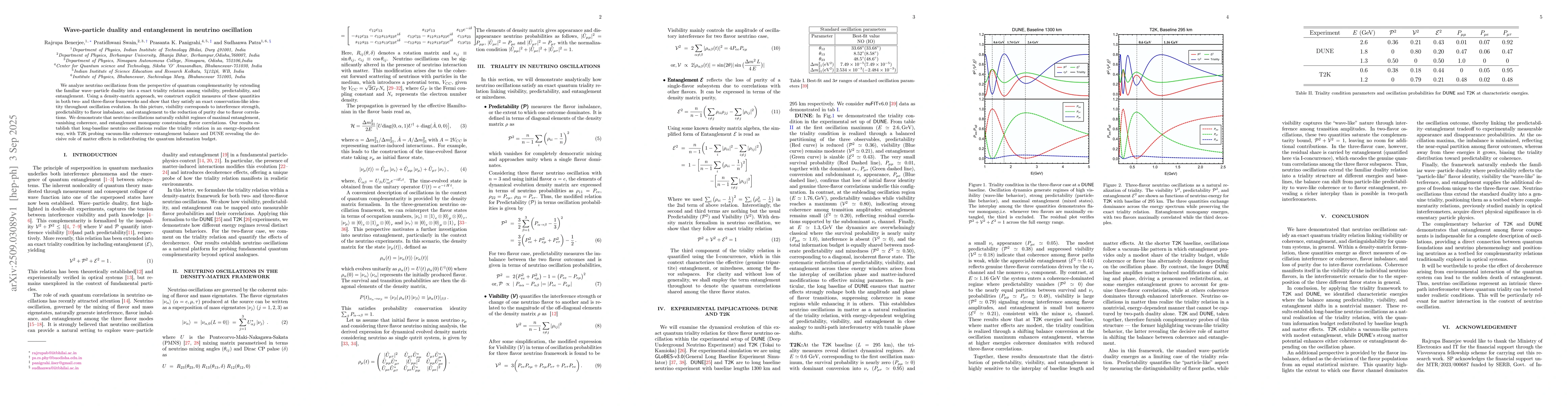 We analyze neutrino oscillations from the perspective of quantum complementarity by extending the familiar wave-particle duality into a exact triality relation among visibility, predictability, and entanglement. Using a density-matrix approach, we construct explicit measures of these quantities in both two- and three-flavor frameworks and show that they satisfy an exact conservation-like identity throughout oscillation evolution. In this picture, visibility corresponds to interference strength, predictability to flavor imbalance, and entanglement to the reduction of purity due to flavor correlations. We demonstrate that neutrino oscillations naturally exhibit regimes of maximal entanglement, vanishing coherence, and entanglement monogamy constraining flavor correlations. Our results establish that long-baseline neutrino oscillations realize the triality relation in an energy-dependent way, with T2K probing vacuum-like coherence entanglement balance and DUNE revealing the decisive role of matter e ects in redistributing the quantum information budget.