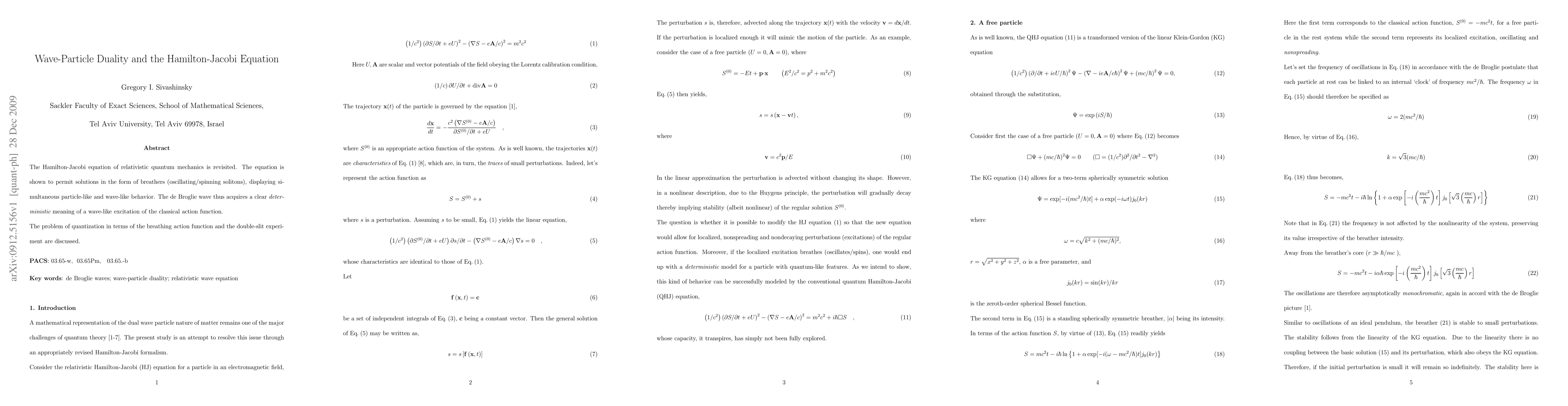 The Hamilton-Jacobi equation of relativistic quantum mechanics is revisited. The equation is shown to permit solutions in the form of breathers (oscillating/spinning solitons), displaying simultaneous particle-like and wave-like behavior. The de Broglie wave thus acquires a clear deterministic meaning of a wave-like excitation of the classical action function. The problem of quantization in terms of the breathing action function and the double-slit experiment are discussed.