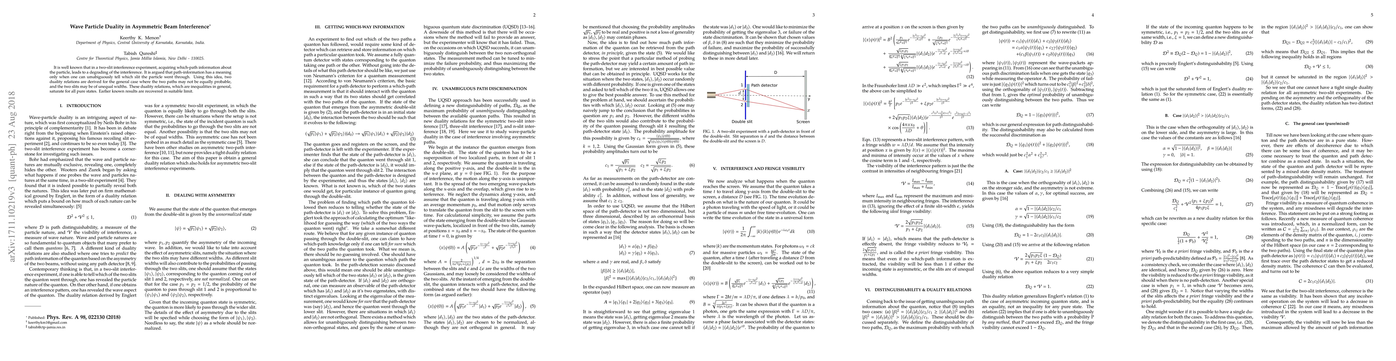 This paper explores wave-particle duality in asymmetric beam interference, deriving new duality relations that apply when the two paths are not equally probable or the slits are of unequal widths. These relations, which are inequalities, hold true for all pure states and recover earlier results under specific conditions.