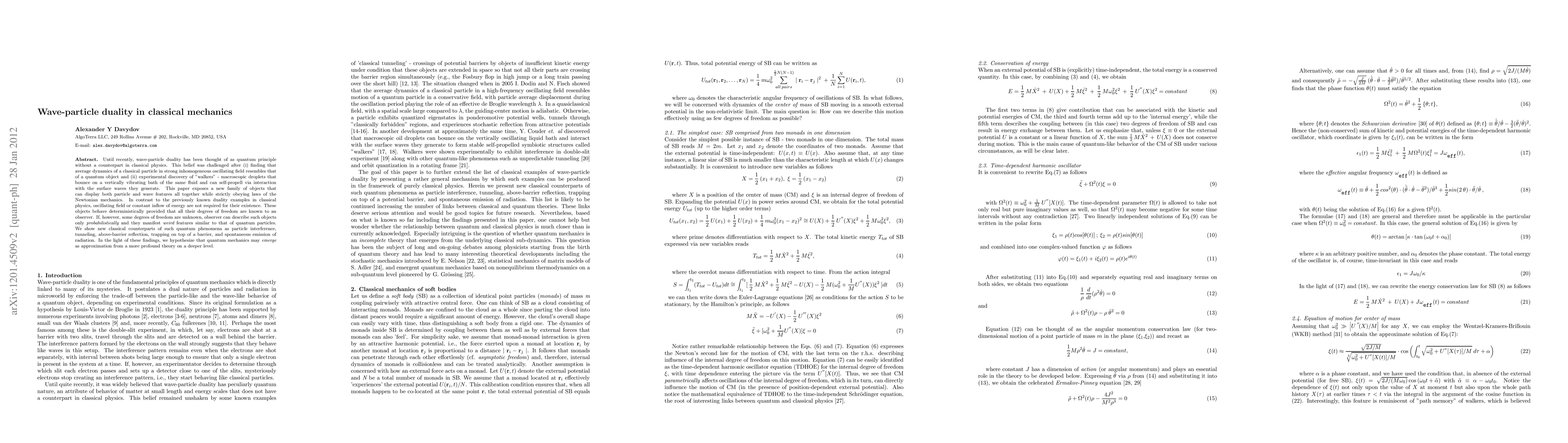 Until recently, wave-particle duality has been thought of as quantum principle without a counterpart in classical physics. This belief was challenged after (i) finding that average dynamics of a classical particle in strong inhomogeneous oscillating field resembles that of a quantum object and (ii) experimental discovery of "walkers" - macroscopic droplets that bounce on a vertically vibrating bath of the same fluid and can self-propell via interaction with the surface waves they generate. This paper exposes a new family of objects that can display both particle and wave features all together while strictly obeying laws of the Newtonian mechanics. In contrast to the previously known duality examples in classical physics, oscillating field or constant inflow of energy are not required for their existence. These objects behave deterministically provided that all their degrees of freedom are known to an observer. If, however, some degrees of freedom are unknown, observer can describe such objects only {\it probabilistically} and they manifest {\it weird} features similar to that of quantum particles. We show new classical counterparts of such quantum phenomena as particle interference, tunneling, above-barrier reflection, trapping on top of a barrier, and spontaneous emission of radiation. In the light of these findings, we hypothesize that quantum mechanics may \emph{emerge} as approximation from a more profound theory on a deeper level.