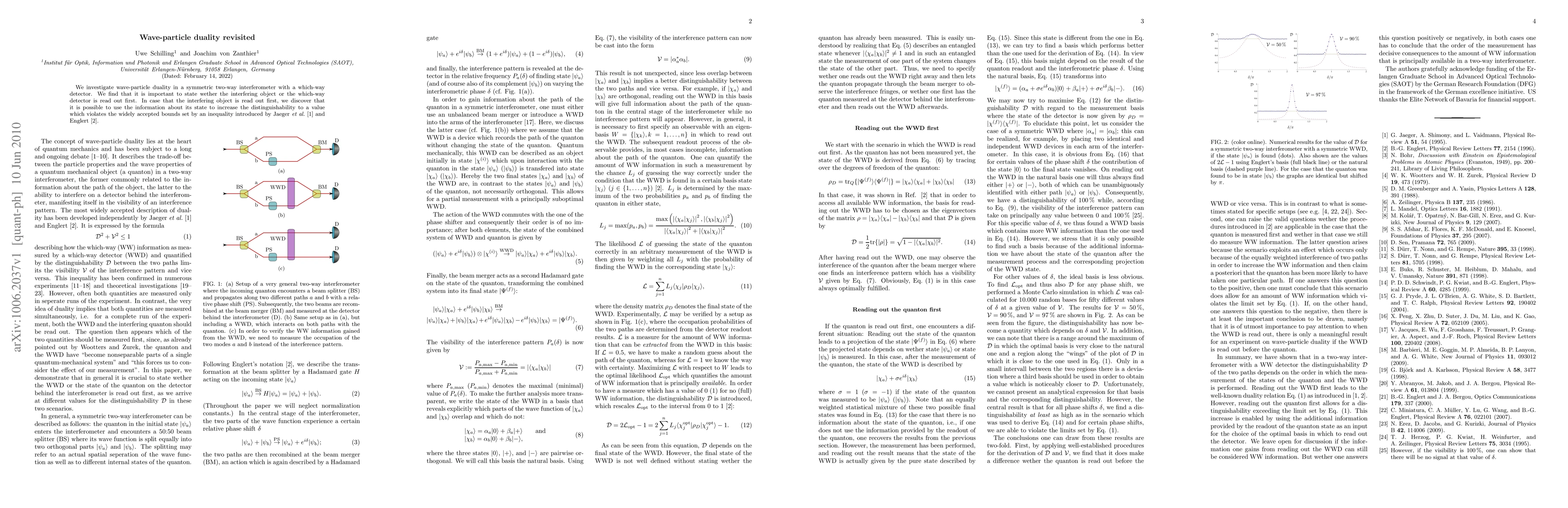 We investigate wave-particle duality in a symmetric two-way interferometer with a which-way detector. We find that it is important to state wether the interfering object or the which-way detector is read out first. In case that the interfering object is read out first, we discover that it is possible to use the information about its state to increase the distinguishability to a value which violates the widely accepted bounds set by an inequality introduced by Jaeger et al. (PRA 51, 54) and Englert (PRL 77, 2154).