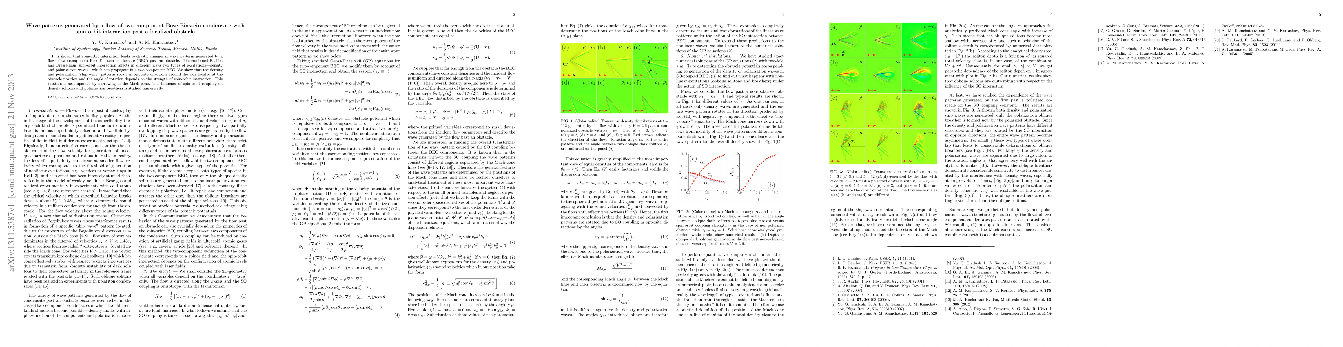 This paper explores how spin-orbit interaction alters wave patterns in a two-component Bose-Einstein condensate (BEC) flowing past an obstacle, showing that density and polarization waves rotate in opposite directions depending on the interaction strength, with the rotation angle and Mach cone narrowing influenced by the spin-orbit coupling. Numerical studies further investigate the effects on density solitons and polarization breathers.