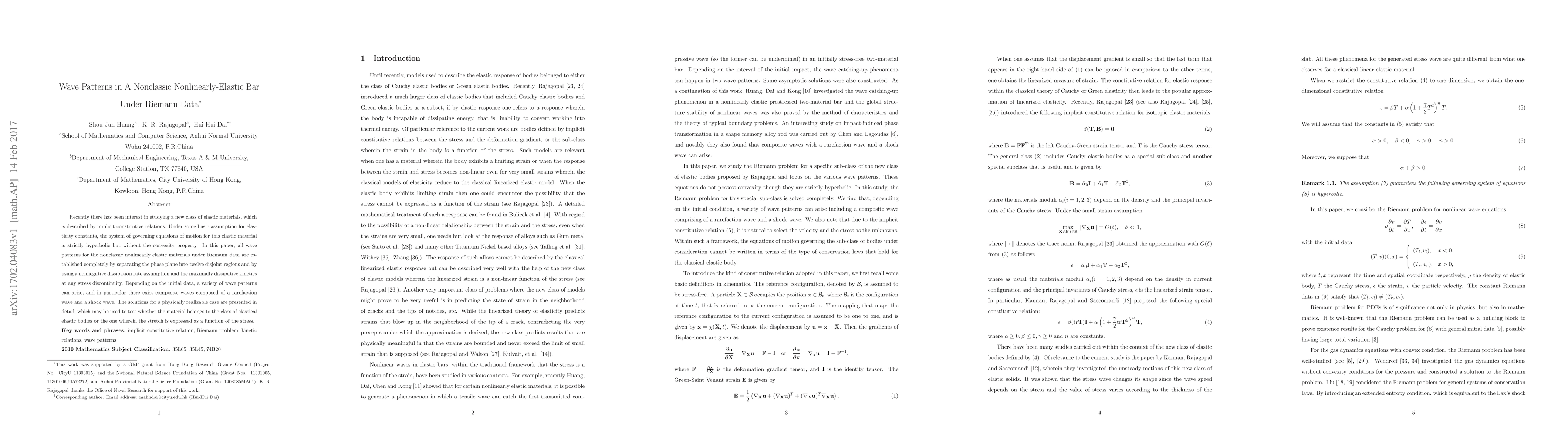 This paper investigates wave patterns in a nonclassic nonlinearly elastic bar characterized by implicit constitutive relations, establishing all possible wave patterns under Riemann data. It categorizes wave behaviors into twelve regions and discusses composite waves, including rarefaction and shock waves, to determine the material's classification.