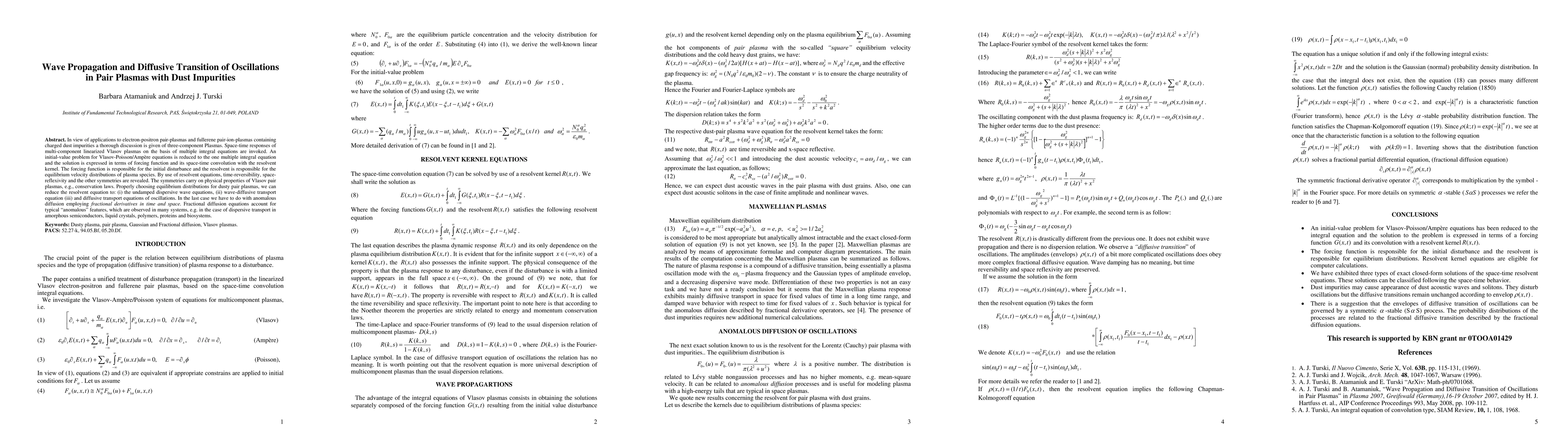 In view of applications to electron-positron pair-plasmas and fullerene pair-ion-plasmas containing charged dust impurities a thorough discussion is given of three-component Plasmas. Space-time responses of multi-component linearized Vlasov plasmas on the basis of multiple integral equations are invoked. An initial-value problem for Vlasov-Poisson -Ampere equations is reduced to the one multiple integral equation and the solution is expressed in terms of forcing function and its space-time convolution with the resolvent kernel. The forcing function is responsible for the initial disturbance and the resolvent is responsible for the equilibrium velocity distributions of plasma species. By use of resolvent equations, time-reversibility, space-reflexivity and the other symmetries are revealed. The symmetries carry on physical properties of Vlasov pair plasmas, e.g., conservation laws. Properly choosing equilibrium distributions for dusty pair plasmas, we can reduce the resolvent equation to: (i) the undamped dispersive wave equations, (ii) wave-diffusive transport equation (iii) and diffusive transport equations of oscillations. In the last case we have to do with anomalous diffusion employing fractional derivatives in time and space. Fractional diffusion equations account for typical anomalous features, which are observed in many systems, e.g. in the case of dispersive transport in amorphous semiconductors, liquid crystals, polymers, proteins and biosystems.