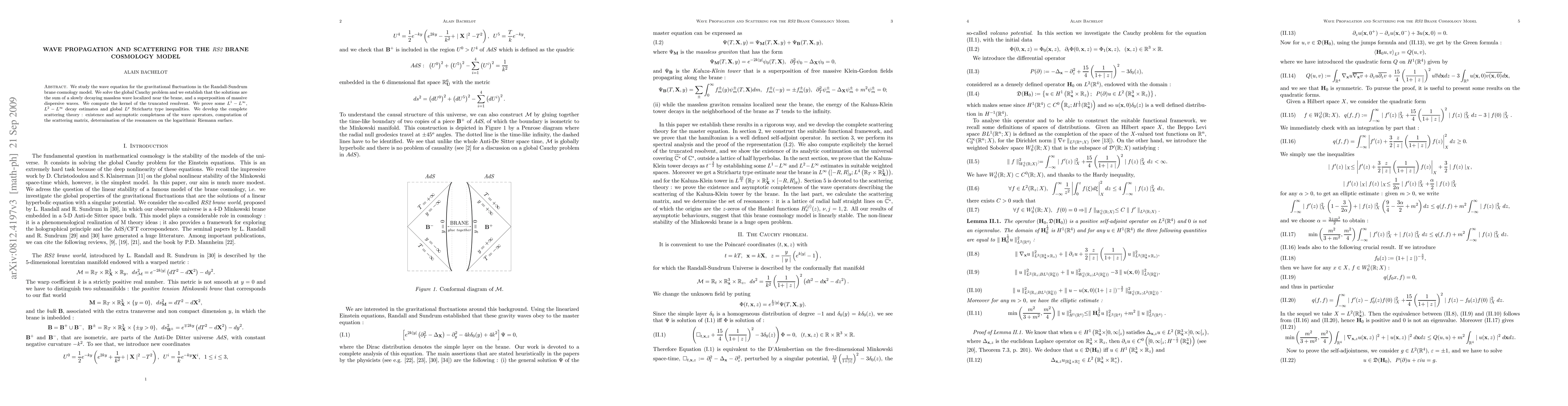 We study the wave equation for the gravitational waves in the Randal-Sundrum brane cosmology model. We solve the global Cauchy problem and we establish that the solutions are the sum of a slowly decaying massless wave localized near the brane, and a superposition of massive dispersive waves. We compute the kernel of the truncated resolvent. We prove some $L^1-L^{\infty}$, $L^2-L^{\infty}$ decay estimates and global $L^p$ Strichartz type inequalities. We develop the complete scattering theory : existence and asymptotic completeness of the wave operators, computation of the scattering matrix, determination of the resonances on the logarithmic Riemann surface.