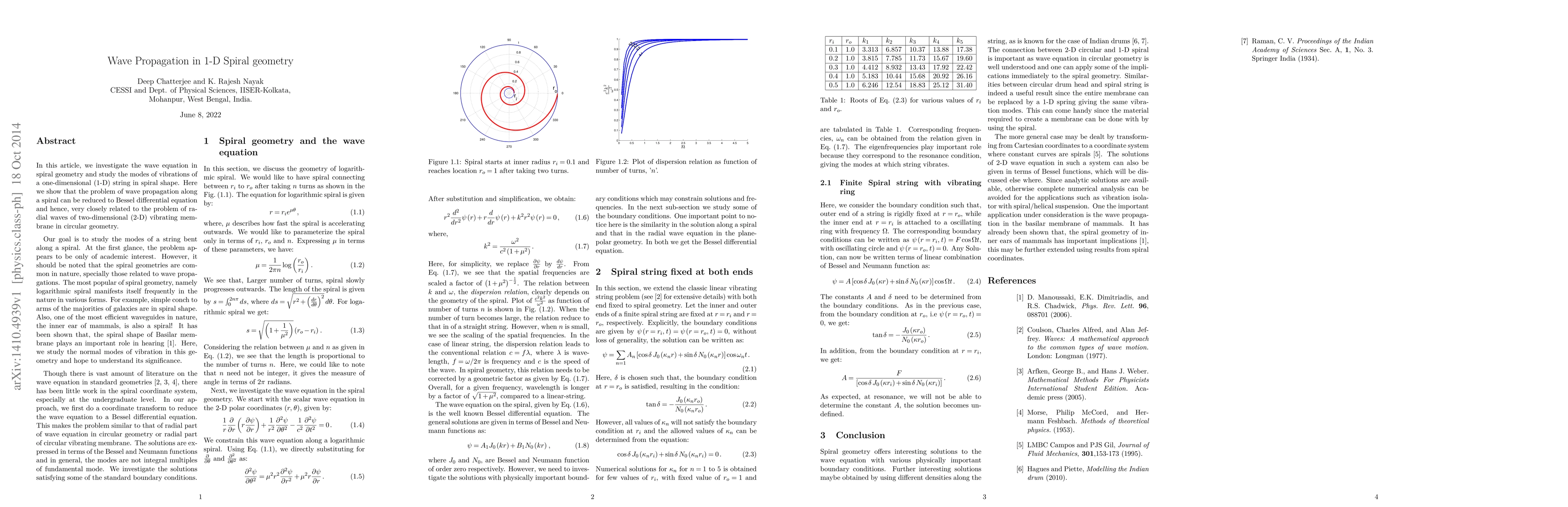The research investigates wave propagation in 1-D spiral geometry by reducing the wave equation to a Bessel differential equation, similar to radial waves in 2-D circular geometry. A coordinate transformation is applied to simplify the problem and express solutions in terms of Bessel and Neumann functions.