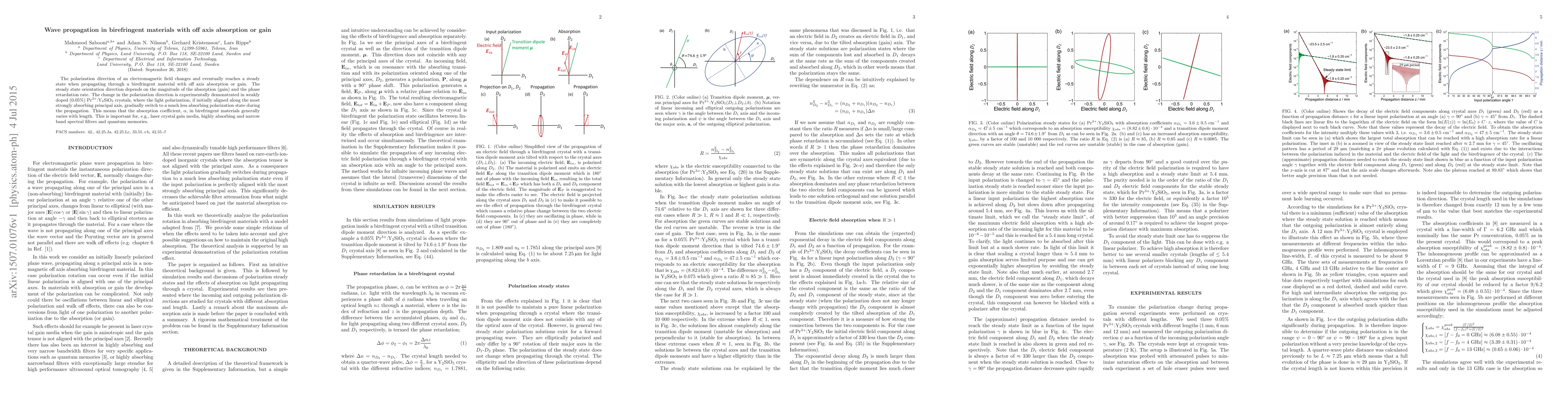 The polarization direction of an electromagnetic field changes and eventually reaches a steady state when propagating through a birefringent material with off axis absorption or gain. The steady state orientation direction depends on the magnitude of the absorption (gain) and the phase retardation rate. The change in the polarization direction is experimentally demonstrated in weakly doped ($0.05\%$) Pr$^{3+}$:Y$_2$SiO$_5$ crystals, where the light polarization, if initially aligned along the most strongly absorbing principal axis, gradually switch to a much less absorbing polarization state during the propagation. This means that the absorption coefficient, $\alpha$, in birefringent materials generally varies with length. This is important for, e.g., laser crystal gain media, highly absorbing and narrow band spectral filters and quantum memories.