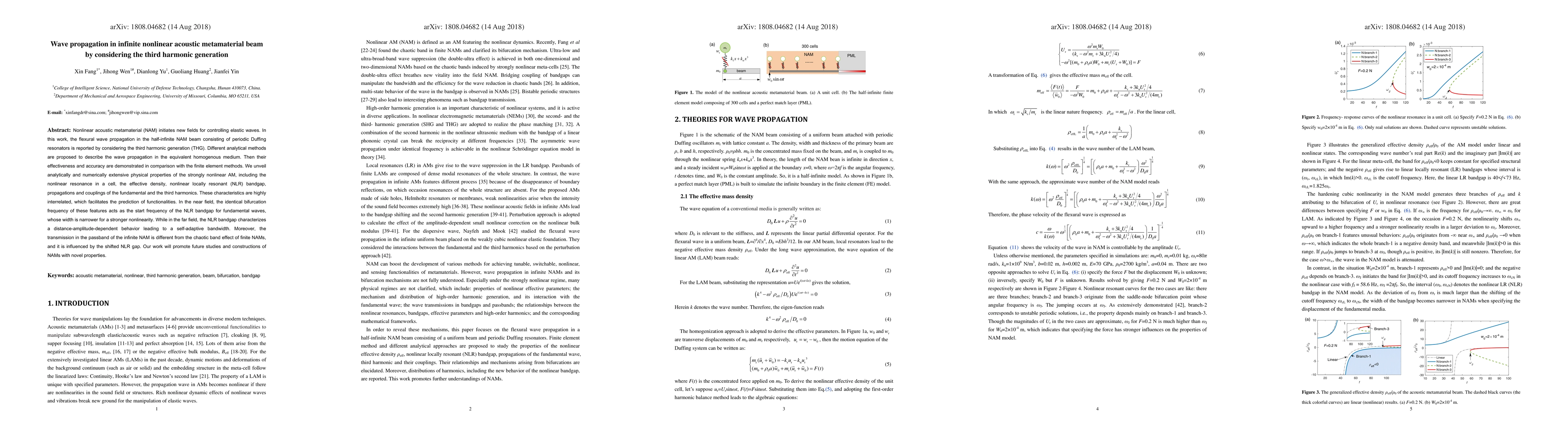 Nonlinear acoustic metamaterial (NAM) initiates new fields for controlling elastic waves. In this work, the flexural wave propagation in the half-infinite NAM beam consisting of periodic Duffing resonators is reported by considering the third harmonic generation (THG). Different analytical methods are proposed to describe the wave propagation in the equivalent homogenous medium. Then their effectiveness and accuracy are demonstrated in comparison with the finite element methods. We unveil analytically and numerically extensive physical properties of the strongly nonlinear AM, including the nonlinear resonance in a cell, the effective density, nonlinear locally resonant (NLR) bandgap, propagations and couplings of the fundamental and the third harmonics. These characteristics are highly interrelated, which facilitates the prediction of functionalities. In the near field, the identical bifurcation frequency of these features acts as the start frequency of the NLR bandgap for fundamental waves, whose width is narrower for a stronger nonlinearity. While in the far field, the NLR bandgap characterizes a distance-amplitude-dependent behavior leading to a self-adaptive bandwidth. Moreover, the transmission in the passband of the infinite NAM is different from the chaotic band effect of finite NAMs, and it is influenced by the shifted NLR gap. Our work will promote future studies and constructions of NAMs with novel properties.