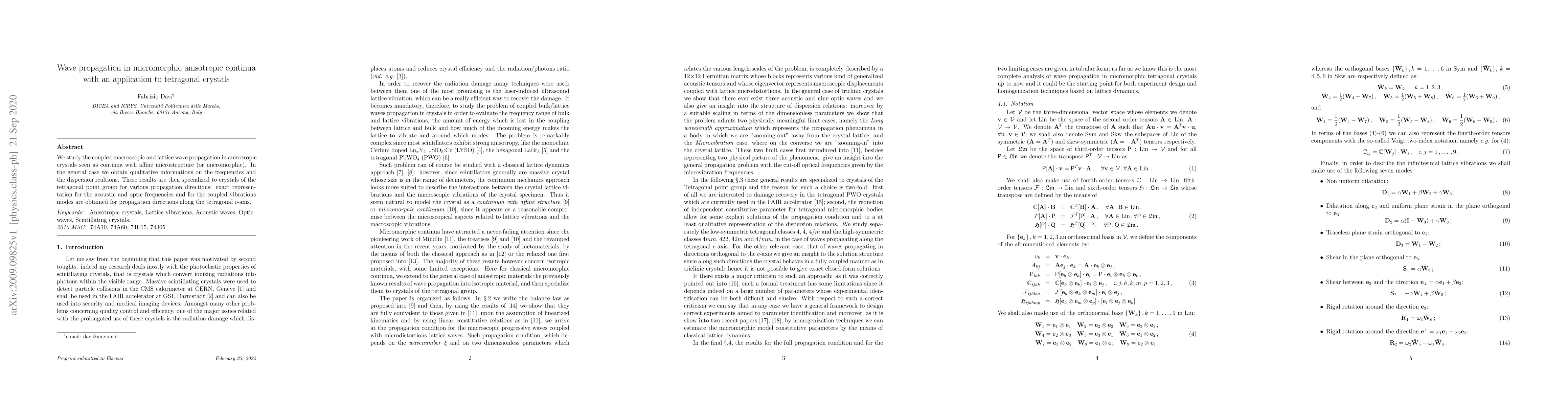 This paper investigates wave propagation in micromorphic anisotropic continua, focusing on tetragonal crystals. It derives qualitative insights into frequencies and dispersion relations, and provides exact representations for acoustic and optic frequencies along the tetragonal c-axis.
