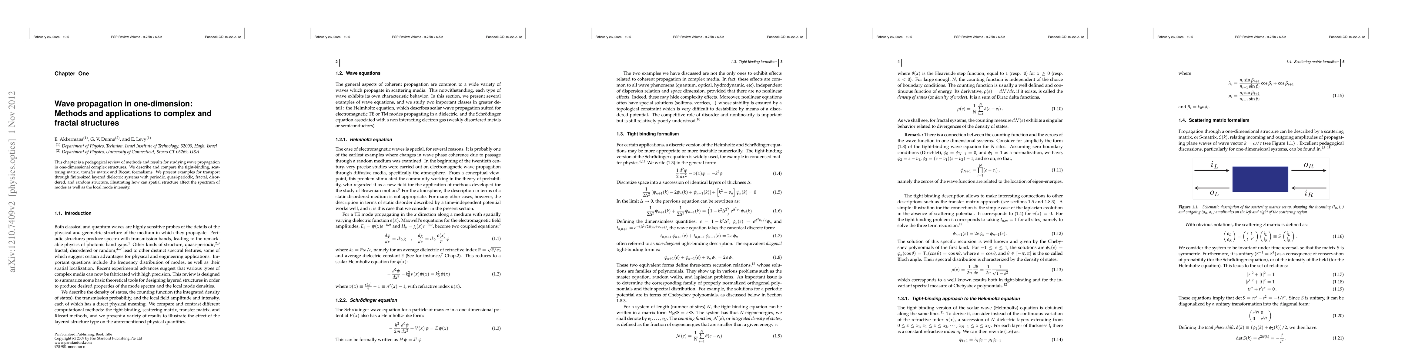 This chapter is a pedagogical review of methods and results for studying wave propagation in one-dimensional complex structures. We describe and compare the tight-binding, scattering matrix, transfer matrix and Riccati formalisms. We present examples for transport through finite-sized layered dielectric systems with periodic, quasi-periodic, fractal, disordered, and random structure, illustrating how can spatial structure affect the spectrum of modes as well as the local mode intensity.