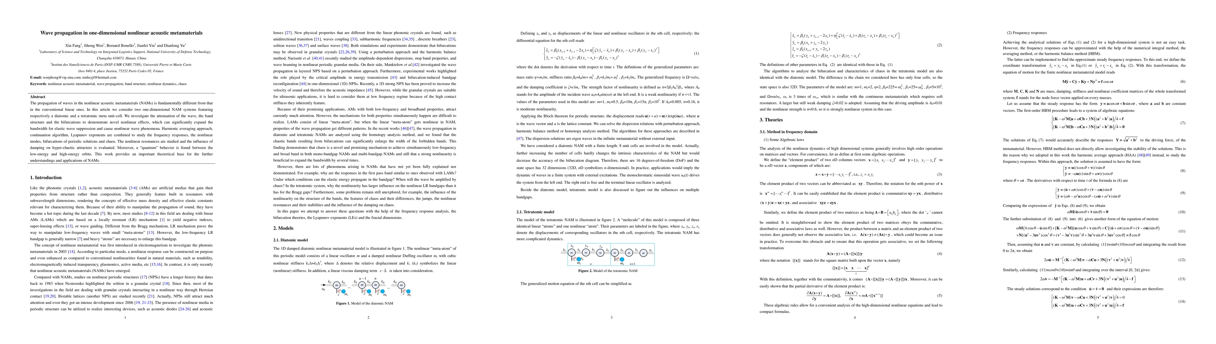 The study investigates wave propagation in one-dimensional nonlinear acoustic metamaterials (NAMs) using diatomic and tetratomic models. Harmonic averaging approach (HAA) and pseudo-arclength continuation algorithm are employed to analyze frequency responses, nonlinear modes, bifurcations, and chaos.
