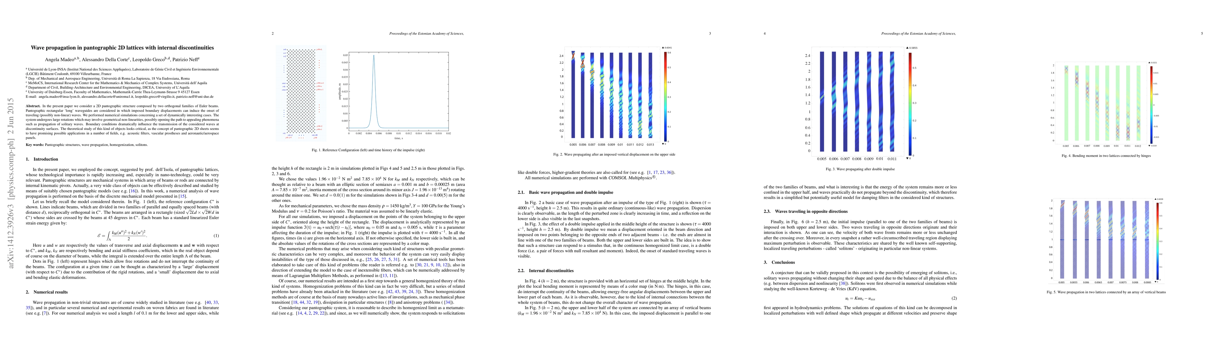 Researchers studied wave propagation in 2D pantographic lattices with internal discontinuities, finding that boundary conditions significantly influence wave transmission at these surfaces.