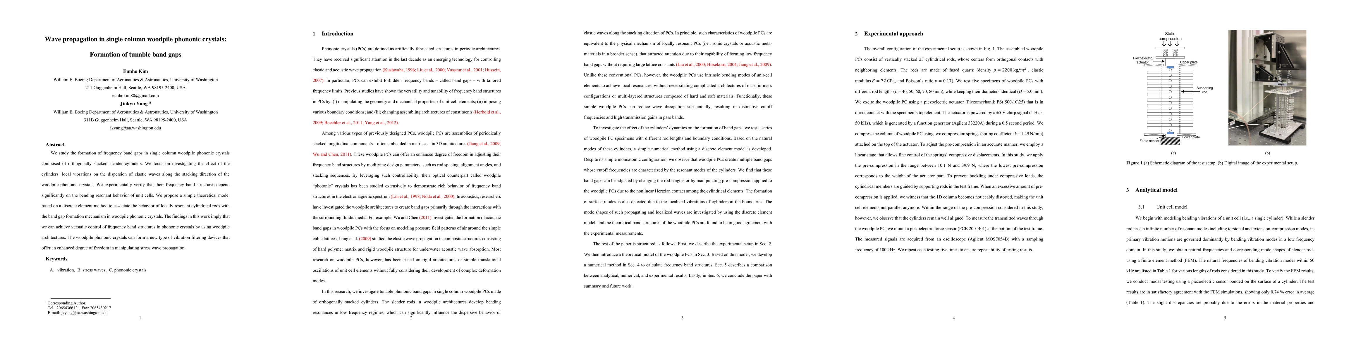 This paper investigates how local vibrations of cylindrical rods in single column woodpile phononic crystals create tunable band gaps, confirming their dependence on bending resonance through experiments and a discrete element theoretical model. The woodpile structure allows versatile control over frequency band structures, enabling advanced vibration filtering and stress wave manipulation.