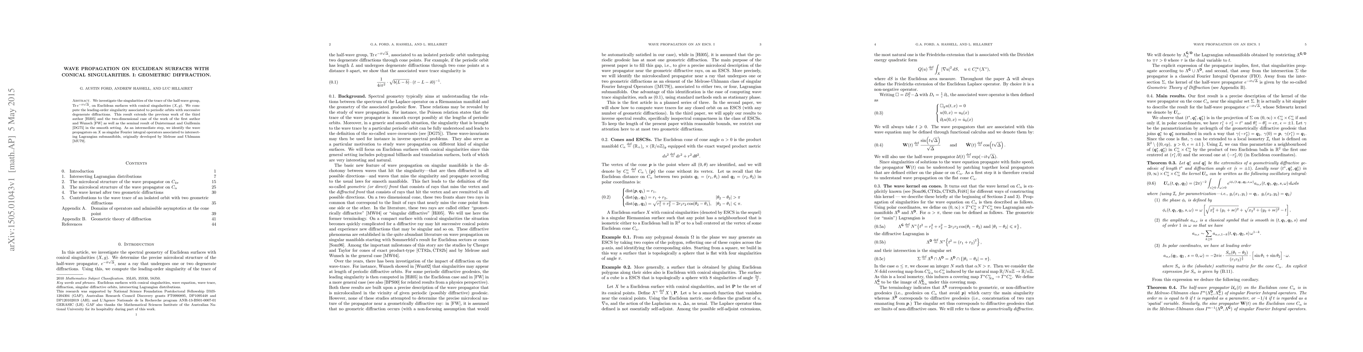 Researchers investigated wave propagation on Euclidean surfaces with conical singularities, extending previous work on geometric diffraction and smooth setting results. They identified the wave propagators as singular Fourier integral operators associated with intersecting Lagrangian submanifolds.