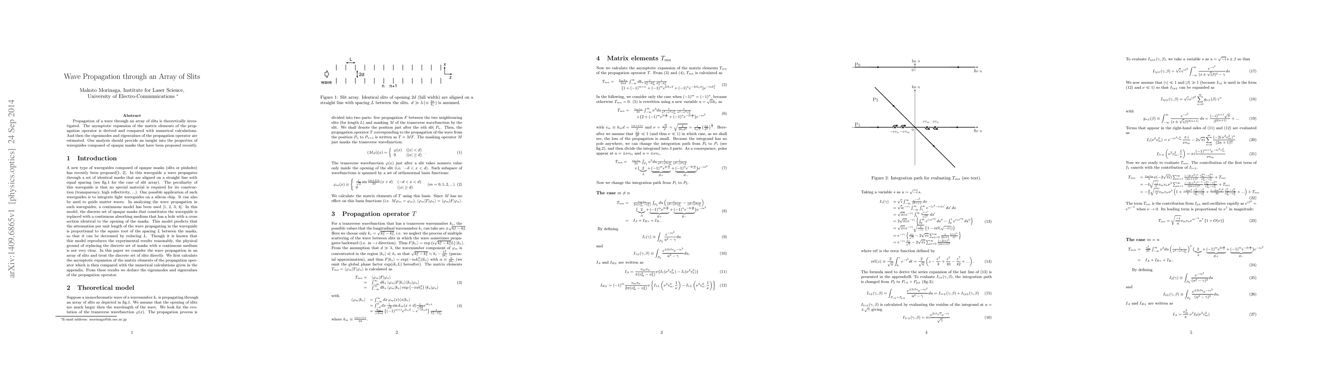 Propagation of a wave through an array of slits is theoretically investigated. The asymptotic expansion of the matrix elements of the propagation operator is derived and compared with numerical calculations. And then the eigenmodes and eigenvalues of the propagation operator are estimated. Our analysis should provide an insight into the properties of waveguides composed of opaque masks that have been proposed recently.