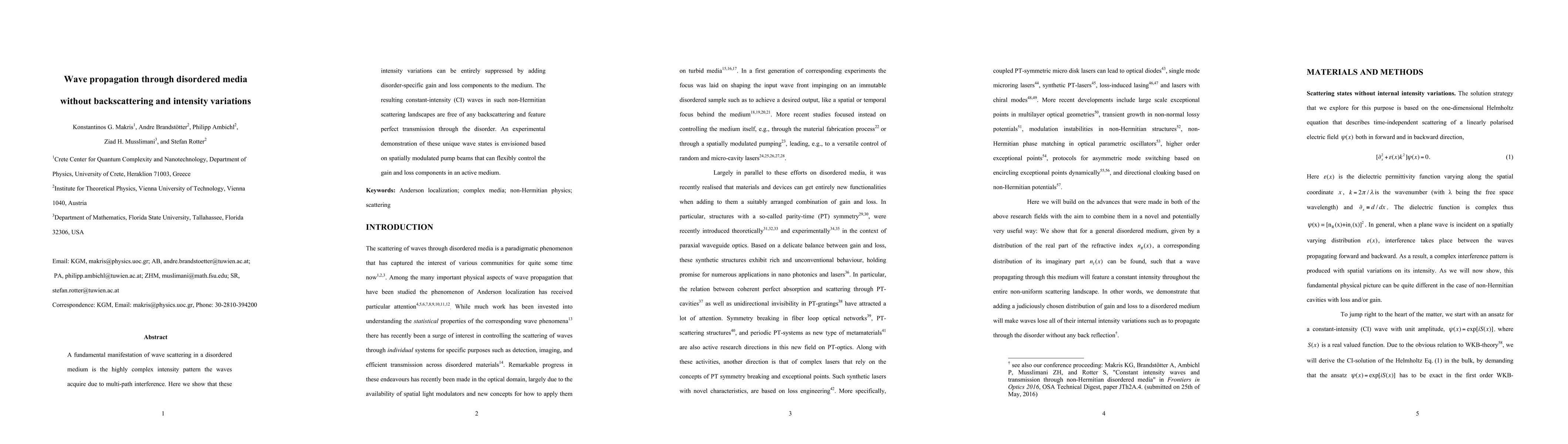 This paper demonstrates that by introducing disorder-specific gain and loss components, wave propagation through disordered media can achieve constant intensity without backscattering, resulting in perfect transmission. An experimental setup using spatially modulated pump beams to control these components is proposed for practical implementation.
