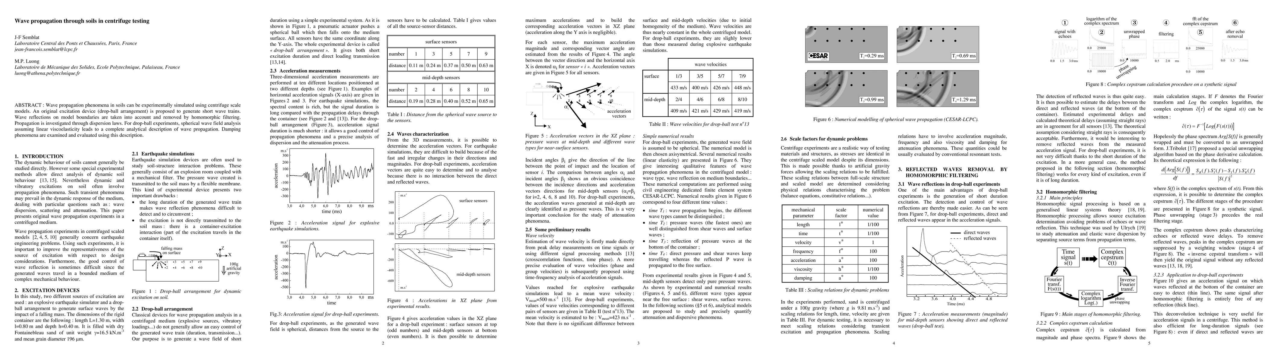 The research employs centrifuge scale models to simulate wave propagation phenomena in soils. An original drop-ball excitation device generates short wave trains, and homomorphic filtering is used to remove wave reflections on model boundaries.