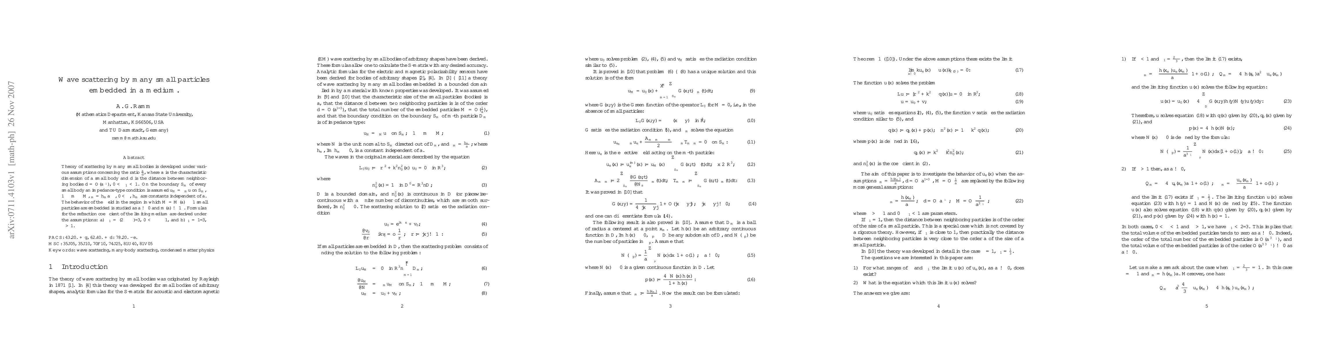 Theory of scattering by many small bodies is developed under various assumptions concerning the ratio $\frac{a}{d}$, where $a$ is the characteristic dimension of a small body and $d$ is the distance between neighboring bodies $d = O(a^{\ka_1})$, $0 < \ka_1 < 1$. On the boundary $S_m$ of every small body an impedance-type condition is assumed $u_N = \zeta_m u$ on $S_m$, $1 \leq m \leq M$, $\zeta_m = h_m a^{-\ka}$, $0 < \ka$, $h_m$ are constants independent of $a$. The behavior of the field in the region in which $M = M(a)\gg 1$ small particles are embedded is studied as $a\ra 0$ and $m(a)\ra \ue$. Formulas for the refraction coefficient of the limiting medium are derived under the assumptions: a) $ \ka_1=(2-\ka)/3$, $0<\ka\leq 1$, and b) $\ka_1=1/3$, $\ka>1$.