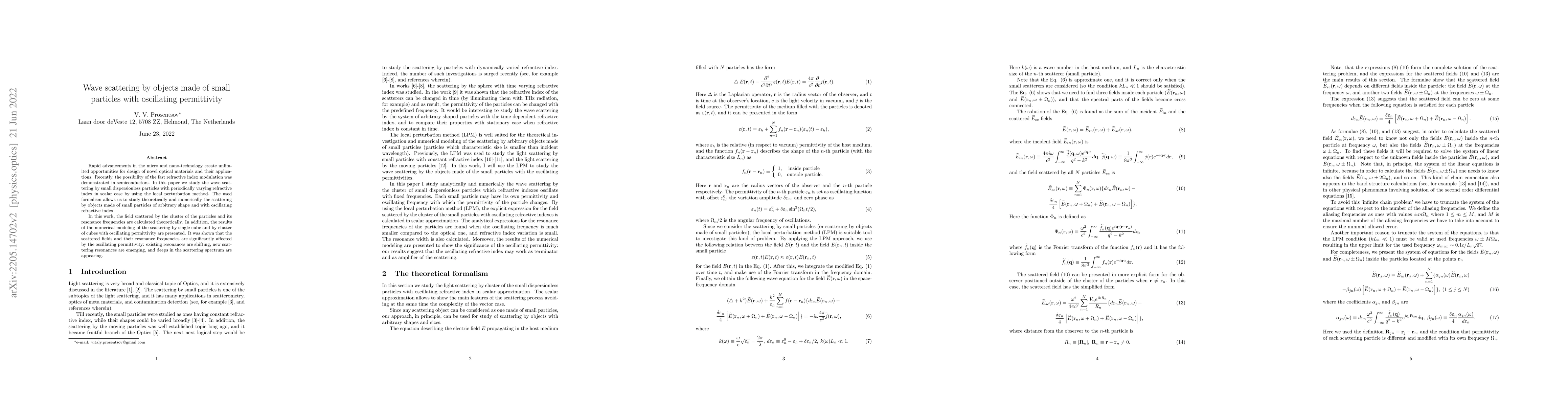 Rapid advancements in the micro and nano-technology create unlimited opportunities for design of novel optical materials and their applications. Recently, the possibility of the fast refractive index modulation was demonstrated in semiconductors. In this paper we study the wave scattering by small dispersionless particles with periodically varying refractive index in scalar case by using the local perturbation method. The used formalism allows us to study theoretically and numerically the scattering by objects made of small particles of arbitrary shape and with oscillating refractive index. In this work, the field scattered by the cluster of the particles and its resonance frequencies are calculated theoretically. In addition, the results of the numerical modeling of the scattering by single cube and by cluster of cubes with oscillating permittivity are presented. It was shown that the scattered fields and their resonance frequencies are significantly affected by the oscillating permittivity: existing resonances are shifting, new scattering resonances are emerging, and deeps in the scattering spectrum are appearing.
