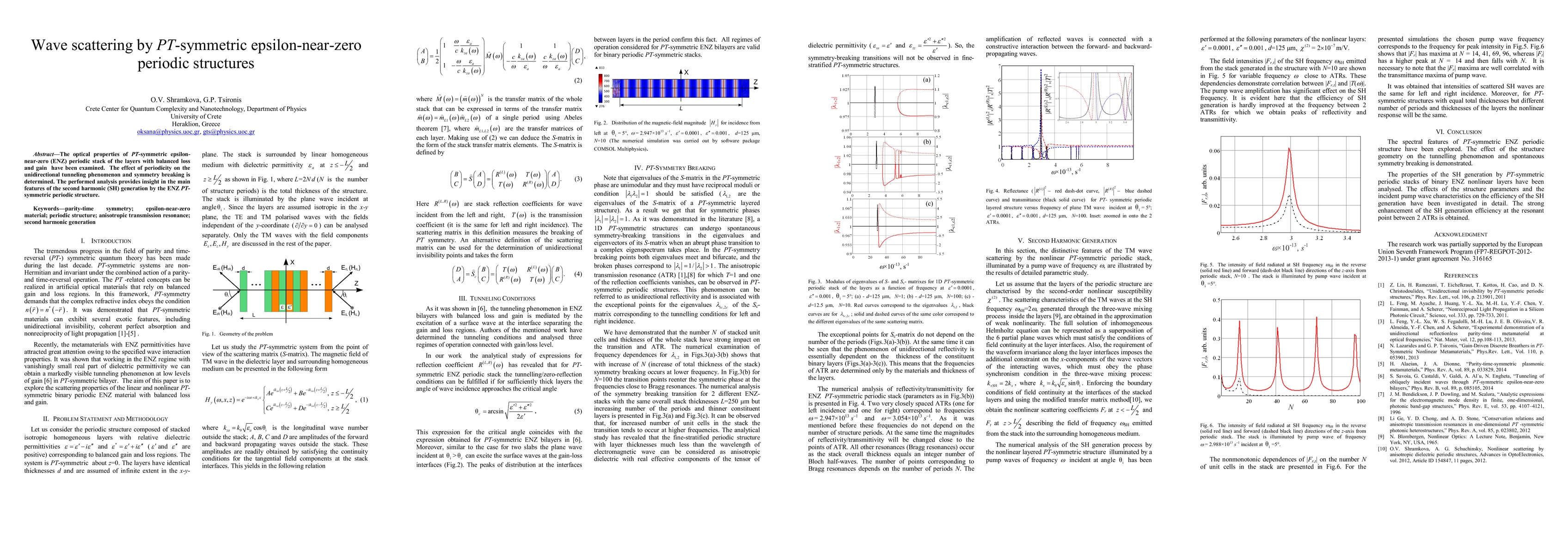 This paper investigates the optical properties of PT-symmetric epsilon-near-zero periodic structures, focusing on the impact of periodicity on unidirectional tunneling and symmetry breaking. It provides insights into the second harmonic generation characteristics of these structures.