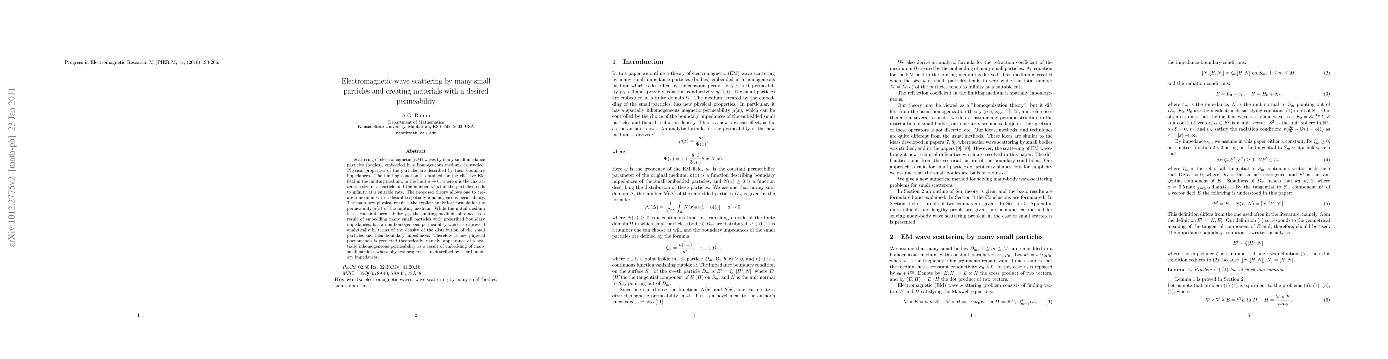 Asymptotic solution to many-body wave scattering problem is given in the case of many small scatterers. The small scatterers can be particles whose physical properties are described by the boundary impedances, or they can be small inhomogeneities, whose physical properties are described by their refraction coefficients. Equations for the effective field in the limiting medium are derived. The limit is considered as the size $a$ of the particles or inhomogeneities tends to zero while their number $M(a)$ tends to infinity. These results are applied to the problem of creating materials with a desired refraction coefficient. For example, the refraction coefficient may have wave-focusing property, or it may have negative refraction, i.e., the group velocity may be directed opposite to the phase velocity. This paper is a review of the author's results presented in MR2442305 (2009g:78016), MR2354140 (2008g:82123), MR2317263 (2008a:35040), MR2362884 (2008j:78010), and contains new results.