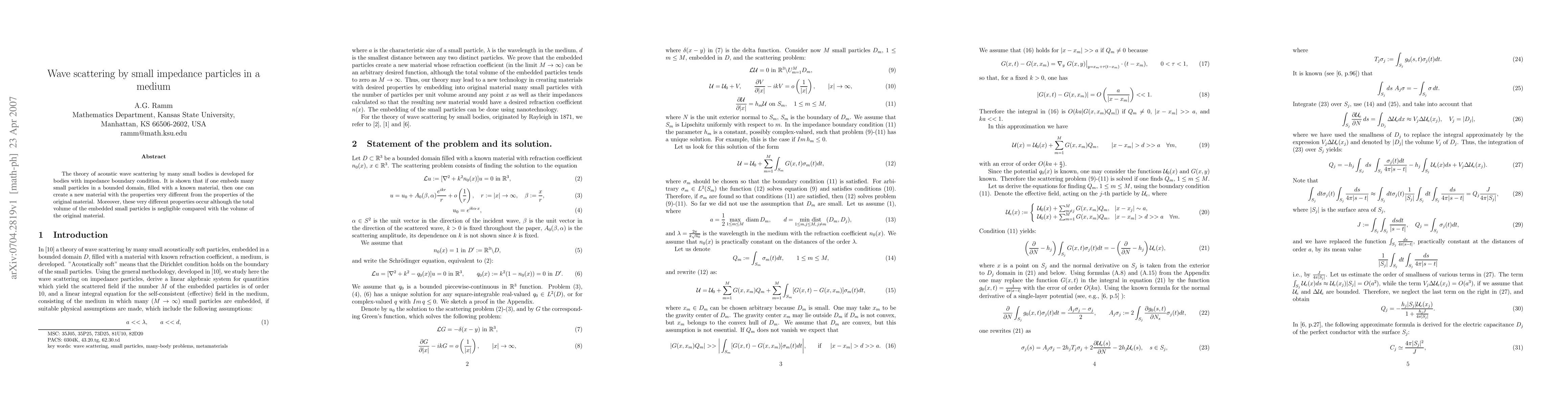 The theory of acoustic wave scattering by many small bodies is developed for bodies with impedance boundary condition. It is shown that if one embeds many small particles in a bounded domain, filled with a known material, then one can create a new material with the properties very different from the properties of the original material. Moreover, these very different properties occur although the total volume of the embedded small particles is negligible compared with the volume of the original material.