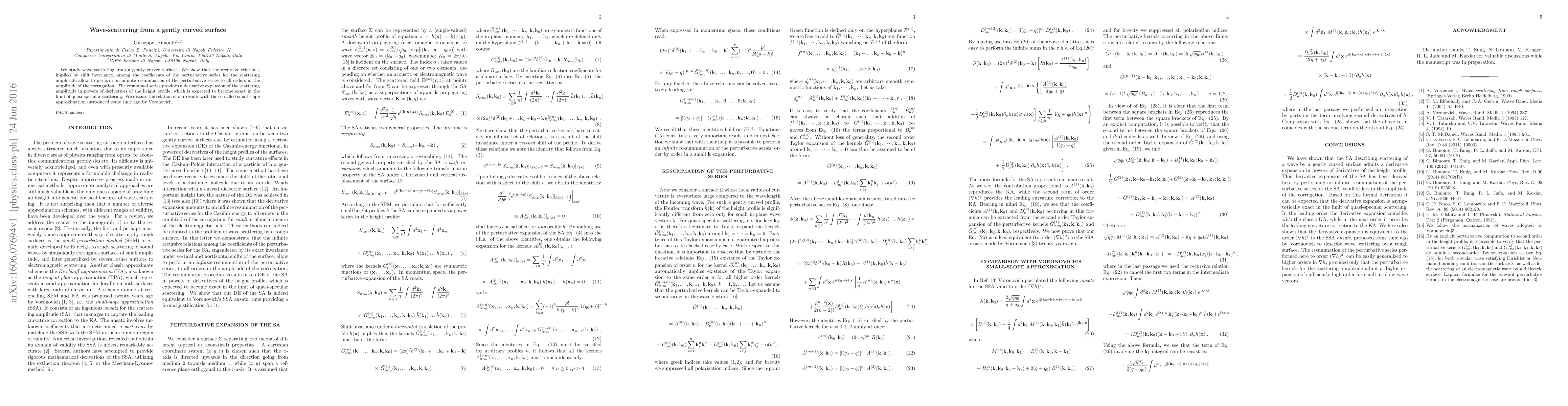 We study wave scattering from a gently curved surface. We show that the recursive relations, implied by shift invariance, among the coefficients of the perturbative series for the scattering amplitude allow to perform an infinite resummation of the perturbative series to all orders in the amplitude of the corrugation. The resummed series provides a derivative expansion of the scattering amplitude in powers of derivatives of the height profile, which is expected to become exact in the limit of quasi-specular scattering. We discuss the relation of our results with the so-called small-slope approximation introduced some time ago by Voronovich.