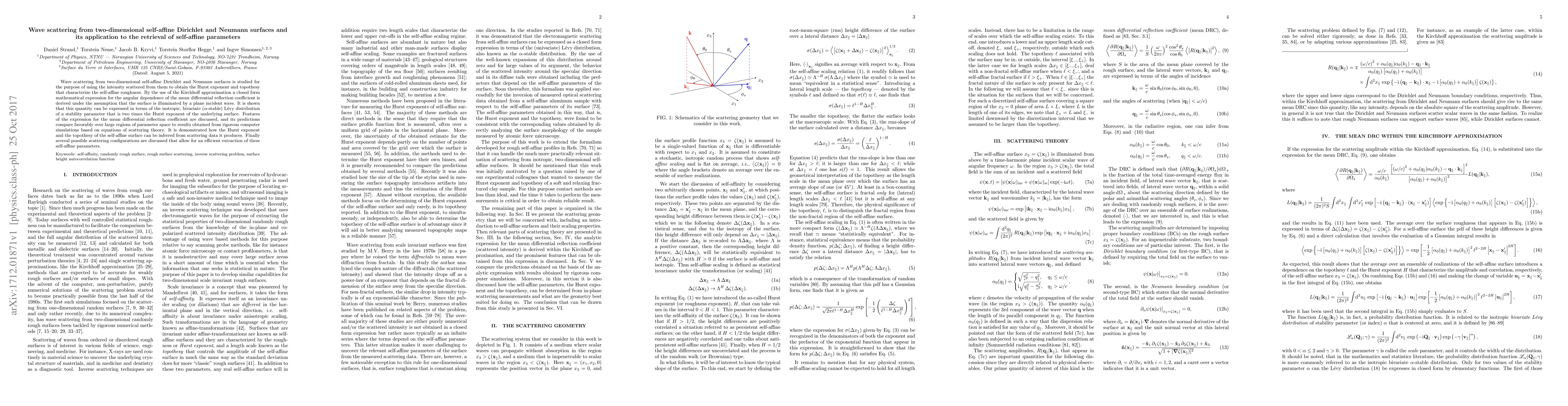 This paper studies wave scattering from two-dimensional self-affine surfaces to retrieve their roughness parameters, deriving a closed-form expression for the mean differential reflection coefficient using Kirchhoff approximation. It demonstrates how scattering data can infer the Hurst exponent and topothesy, and discusses efficient scattering configurations for parameter extraction.