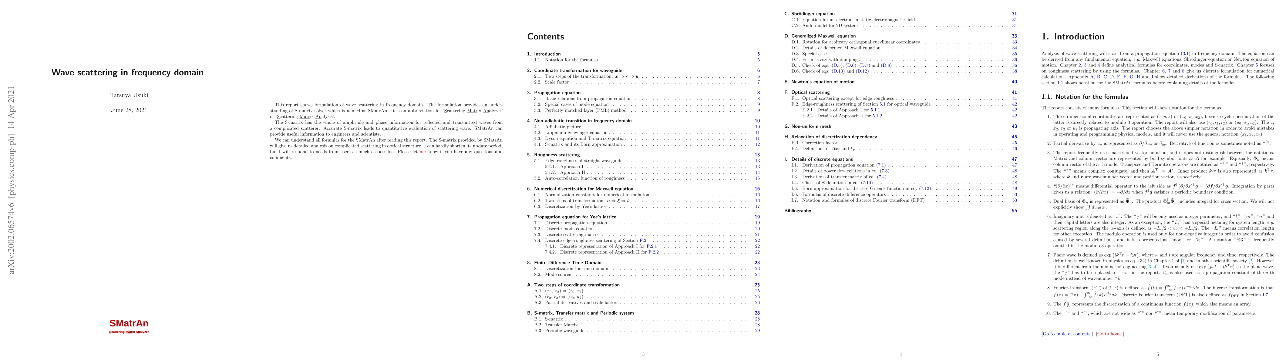 This report shows formulation of wave scattering in frequency domain. The formulation provides an understanding of S-matrix solver which is named as Scattering Matrix Analyzer (SMatrAn). The S-matrix has the whole of amplitude and phase information for reflected and transmitted waves from a complicated scatterer. Accurate S-matrix leads to quantitative evaluation of scattering wave. We can understand all formulas for the SMatrAn after reading this report. The S-matrix provided by SMatrAn will give us detailed analysis on complicated scattering in optical structure.