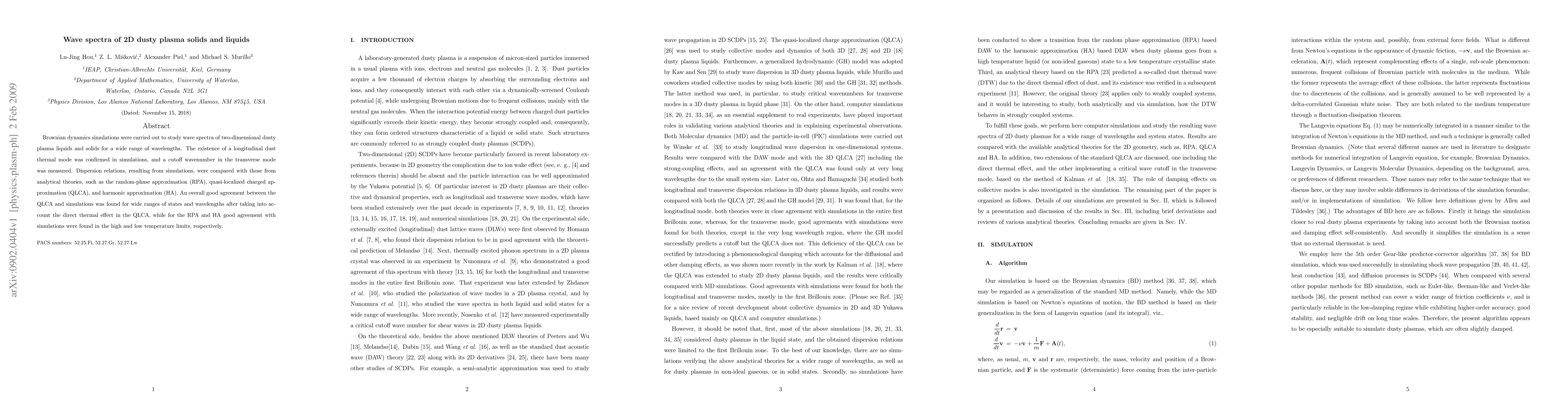 Brownian dynamics simulations were carried out to study wave spectra of two-dimensional dusty plasma liquids and solids for a wide range of wavelengths. The existence of a longitudinal dust thermal mode was confirmed in simulations, and a cutoff wavenumber in the transverse mode was measured. Dispersion relations, resulting from simulations, were compared with those from analytical theories, such as the random-phase approximation (RPA), quasi-localized charged approximation (QLCA), and harmonic approximation (HA). An overall good agreement between the QLCA and simulations was found for wide ranges of states and wavelengths after taking into account the direct thermal effect in the QLCA, while for the RPA and HA good agreement with simulations were found in the high and low temperature limits, respectively.
