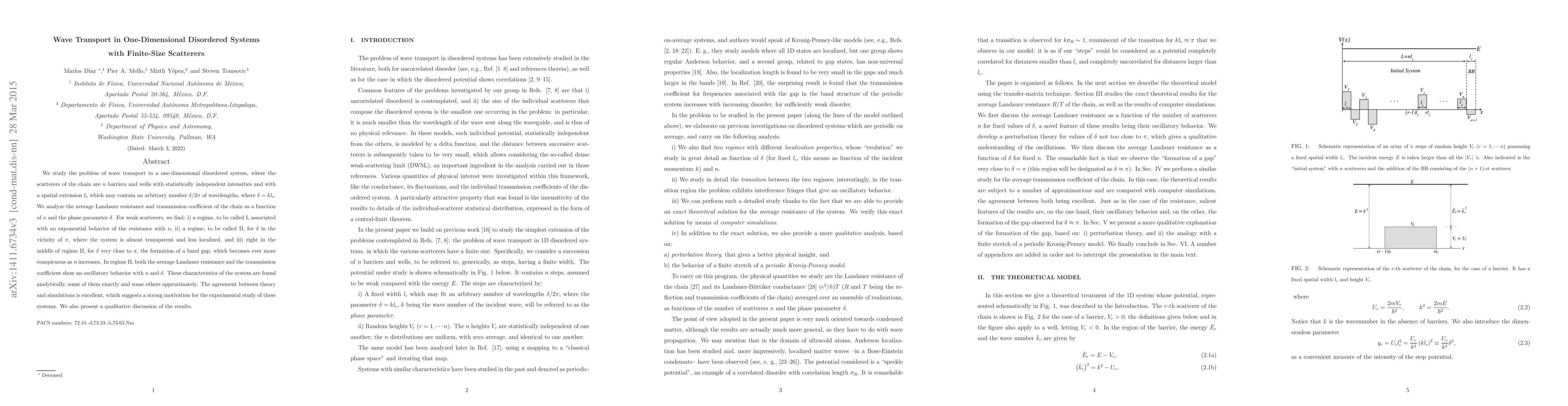 This paper investigates wave transport in one-dimensional disordered systems with finite-size scatterers, identifying three regimes: regime I with exponential resistance growth, regime II with near transparency and oscillatory behavior, and a band gap formation near $\delta \approx \pi$. Analytical and simulation results show strong agreement, suggesting potential for experimental study.