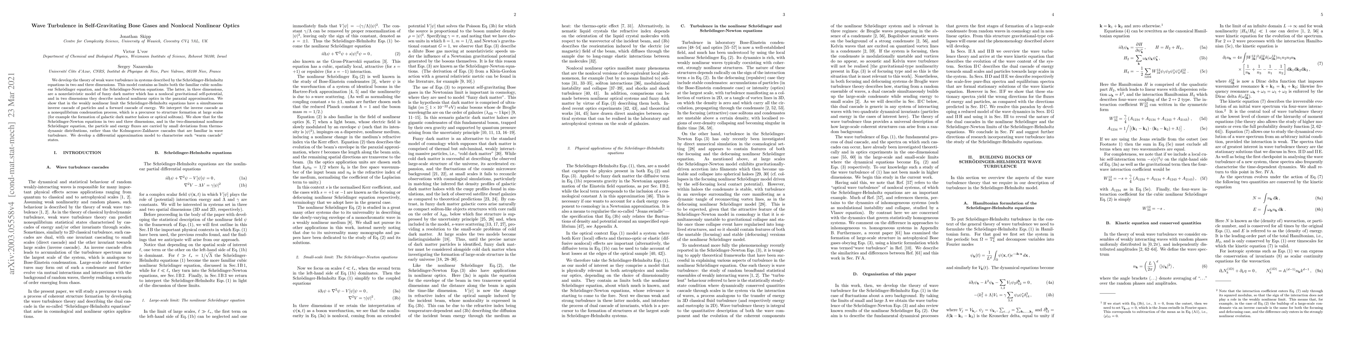 This research develops a theory for wave turbulence in systems governed by Schrödinger-Helmholtz equations, applicable to Bose gases and nonlinear optics. It reveals a simultaneous inverse cascade of particles and forward cascade of energy, interpreting the former as a condensation process leading to large-scale structure formation, similar to dark matter haloes or optical solitons. The study also identifies 'warm cascade' states in specific equations, distinct from Kolmogorov-Zakharov cascades.