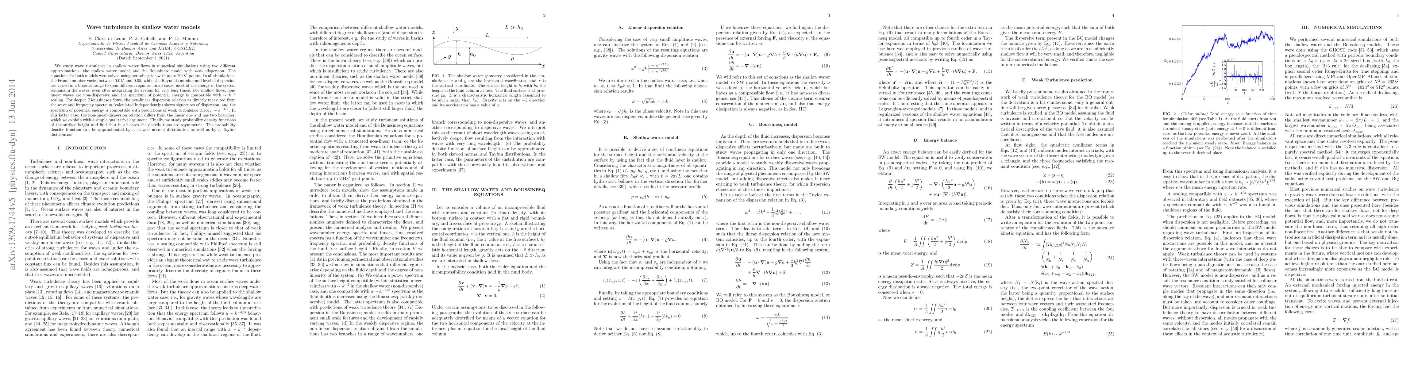 We study wave turbulence in shallow water flows in numerical simulations using two different approximations: the shallow water model, and the Boussinesq model with weak dispersion. The equations for both models were solved using periodic grids with up to $2048^2$ points. In all simulations, the Froude number varies between $0.015$ and $0.05$, while the Reynolds number and level of dispersion are varied in a broader range to span different regimes. In all cases, most of the energy in the system remains in the waves, even after integrating the system for very long times. For shallow flows, non-linear waves are non-dispersive and the spectrum of potential energy is compatible with $\sim k^{-2}$ scaling. For deeper (Boussinesq) flows, the non-linear dispersion relation as directly measured from the wave and frequency spectrum (calculated independently) shows signatures of dispersion, and the spectrum of potential energy is compatible with predictions of weak turbulence theory, $\sim k^{-4/3}$. In this latter case, the non-linear dispersion relation differs from the linear one and has two branches, which we explain with a simple qualitative argument. Finally, we study probability density functions of the surface height and find that in all cases the distributions are asymmetric. The probability density function can be approximated by a skewed normal distribution as well as by a Tayfun distribution.