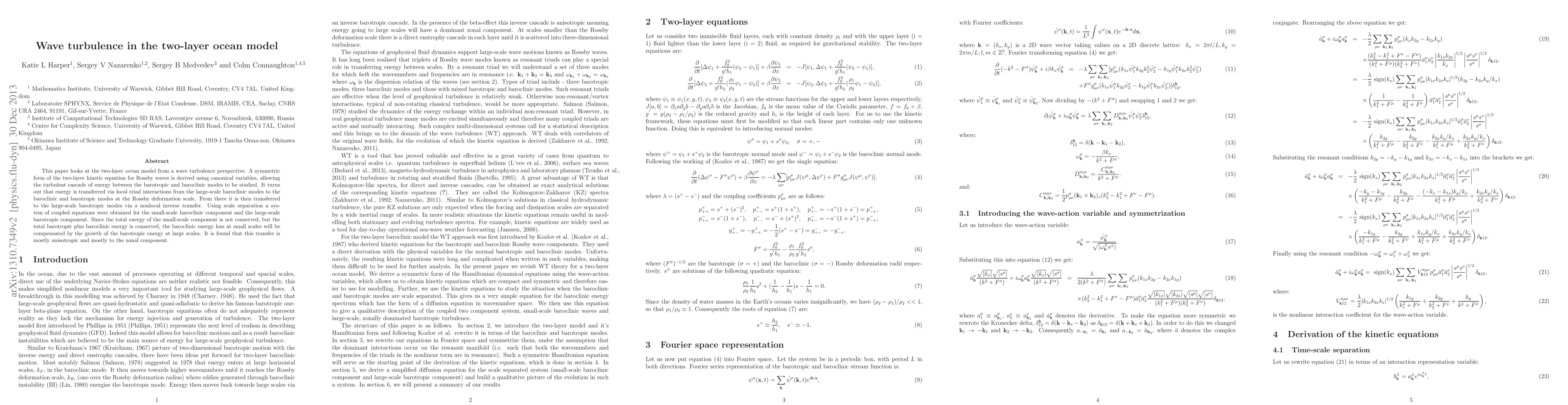 This paper looks at the two-layer ocean model from a wave turbulence perspective. A symmetric form of the two-layer kinetic equation for Rossby waves is derived using canonical variables, allowing the turbulent cascade of energy between the barotropic and baroclinic modes to be studied. It turns out that energy is transferred via local triad interactions from the large-scale baroclinic modes to the baroclinic and barotropic modes at the Rossby deformation scale. From there it is then transferred to the large-scale barotropic modes via a nonlocal inverse transfer. Using scale separation a sys- tem of coupled equations were obtained for the small-scale baroclinic component and the large-scale barotropic component. Since the total energy of the small-scale component is not conserved, but the total barotropic plus baroclinic energy is conserved, the baroclinic energy loss at small scales will be compensated by the growth of the barotropic energy at large scales. It is found that this transfer is mostly anisotropic and mostly to the zonal component.