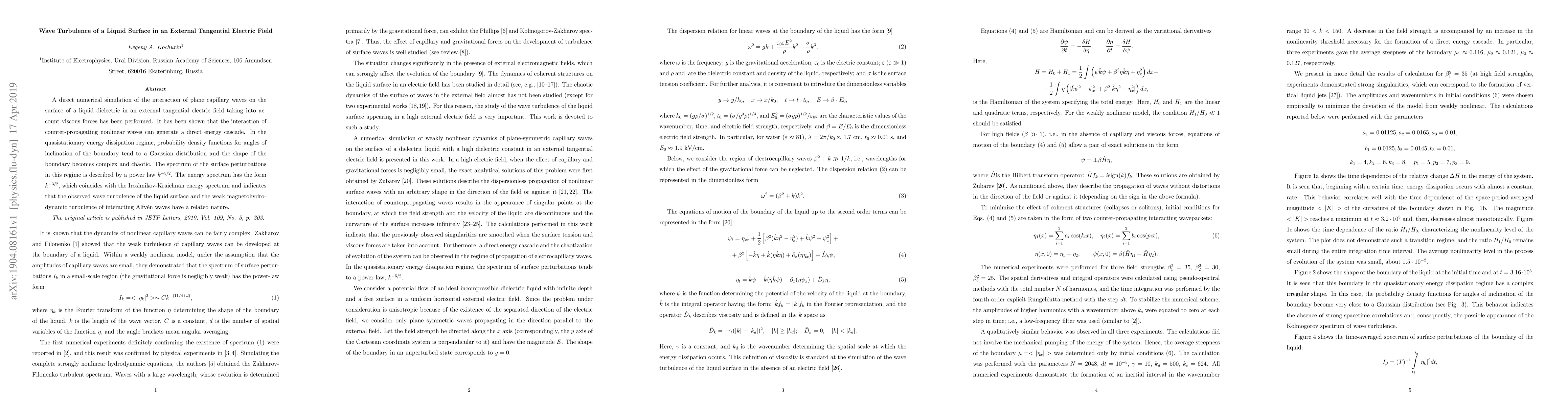 A direct numerical simulation of the interaction of plane capillary waves on the surface of a liquid dielectric in an external tangential electric field taking into account viscous forces has been performed. It has been shown that the interaction of counter-propagating nonlinear waves can generate a direct energy cascade. In the quasistationary energy dissipation regime, probability density functions for angles of inclination of the boundary tend to a Gaussian distribution and the shape of the boundary becomes complex and chaotic. The spectrum of the surface perturbations in this regime is described by a power law $k^{-5/2}$. The energy spectrum has the form $k^{-3/2}$, which coincides with the Iroshnikov-Kraichnan energy spectrum and indicates that the observed wave turbulence of the liquid surface and the weak magnetohydrodynamic turbulence of interacting Alfv\'en waves have a related nature.