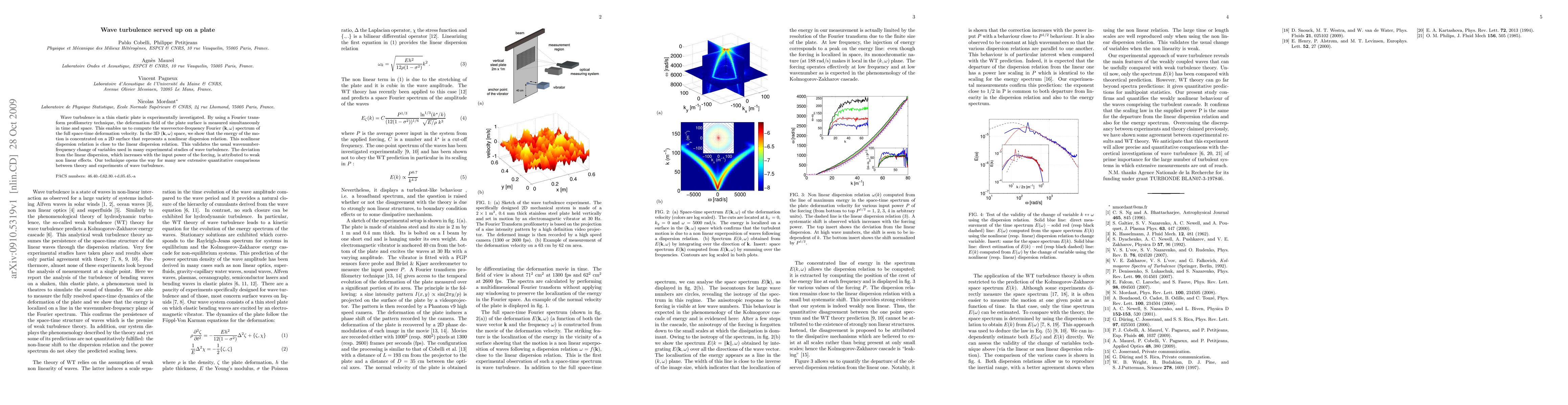 Wave turbulence in a thin elastic plate is experimentally investigated. By using a Fourier transform profilometry technique, the deformation field of the plate surface is measured simultaneously in time and space. This enables us to compute the wavevector-frequency Fourier ($\mathbf k, \omega$) spectrum of the full space-time deformation velocity. In the 3D ($\mathbf k, \omega$) space, we show that the energy of the motion is concentrated on a 2D surface that represents a nonlinear dispersion relation. This nonlinear dispersion relation is close to the linear dispersion relation. This validates the usual wavenumber-frequency change of variables used in many experimental studies of wave turbulence. The deviation from the linear dispersion, which increases with the input power of the forcing, is attributed to weak non linear effects. Our technique opens the way for many new extensive quantitative comparisons between theory and experiments of wave turbulence.