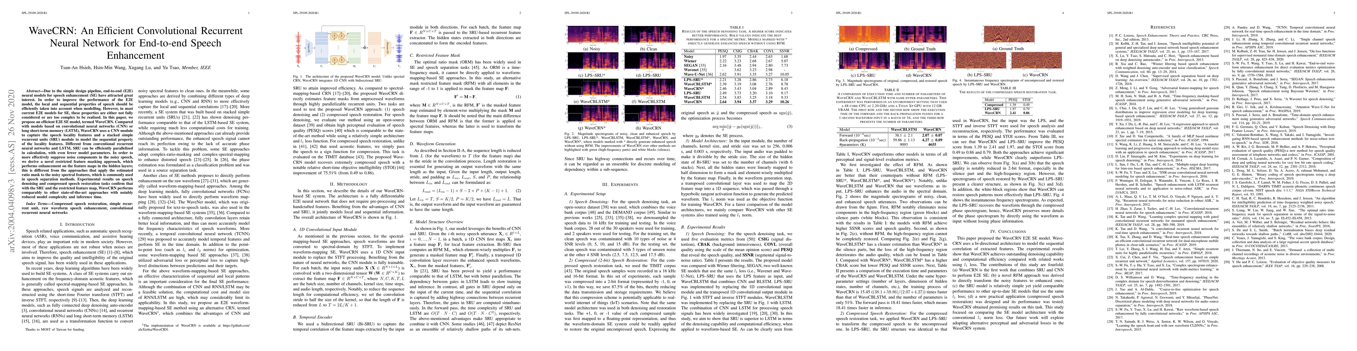 WaveCRN is an efficient end-to-end speech enhancement model that leverages convolutional neural networks for capturing speech locality and simple recurrent units for temporal sequential modeling, achieving competitive performance with reduced complexity and faster inference compared to traditional methods. The novel restricted feature masking approach further enhances noise suppression.