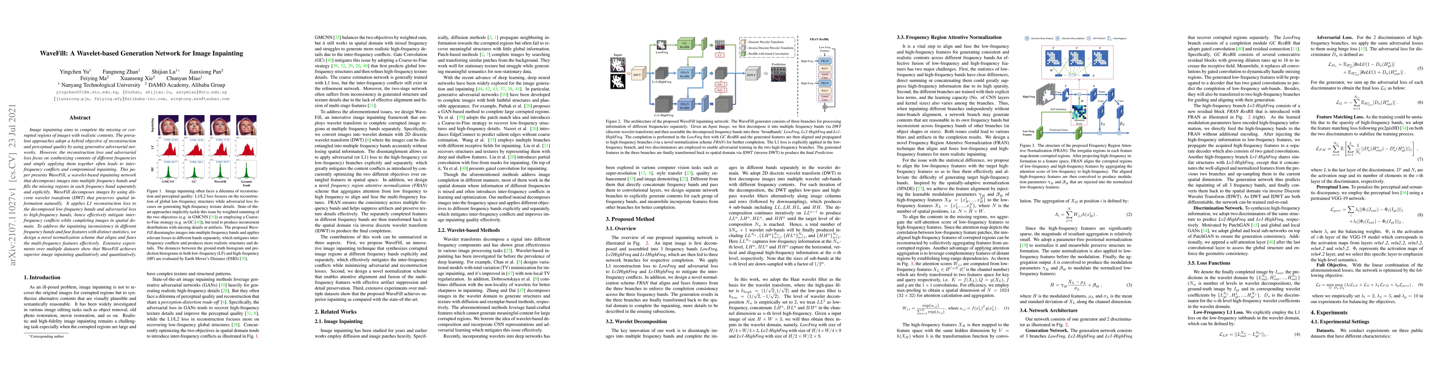 WaveFill is a wavelet-based network for image inpainting that decomposes images into frequency bands and fills missing regions separately, using L1 loss for low-frequencies and adversarial loss for high-frequencies to mitigate inter-frequency conflicts, achieving superior results.