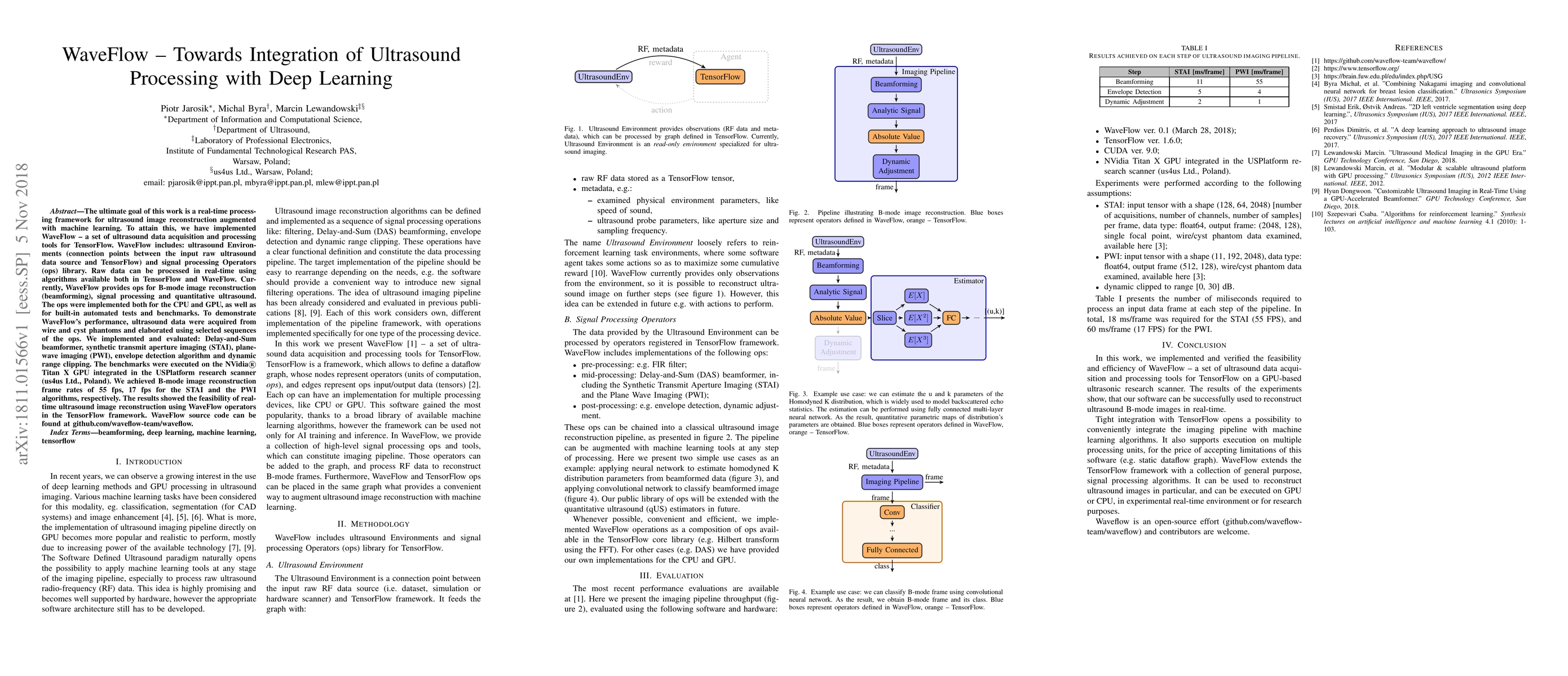 WaveFlow integrates ultrasound data acquisition and processing tools with TensorFlow for real-time ultrasound image reconstruction, achieving frame rates of 55 fps for B-mode and 17 fps for synthetic and plane-wave imaging algorithms. The framework includes operators for beamforming and signal processing optimized for both CPU and GPU.
