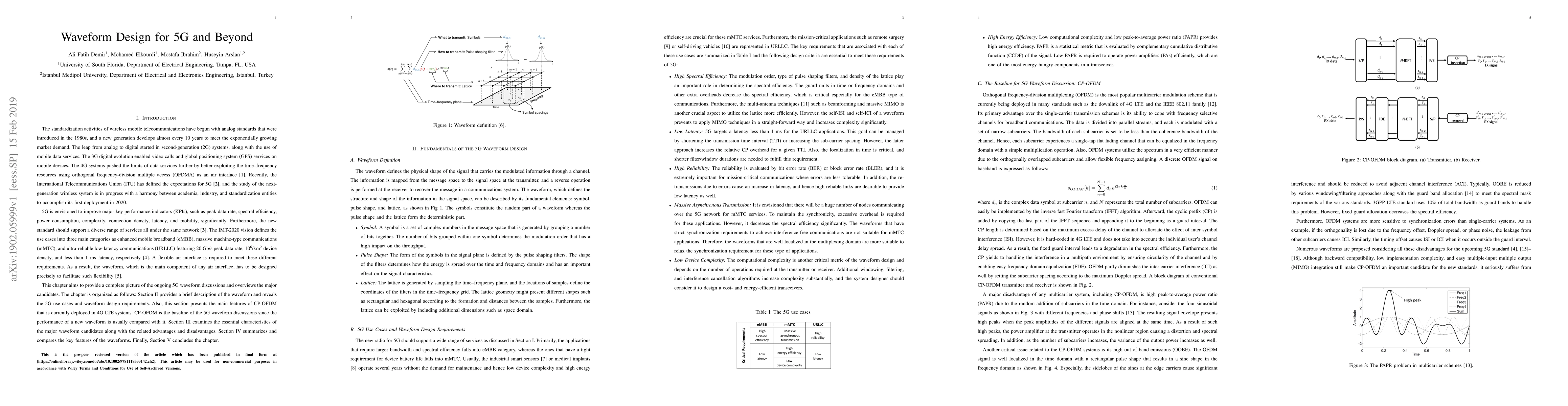 5G is envisioned to improve major key performance indicators (KPIs), such as peak data rate, spectral efficiency, power consumption, complexity, connection density, latency, and mobility. This chapter aims to provide a complete picture of the ongoing 5G waveform discussions and overviews the major candidates. It provides a brief description of the waveform and reveals the 5G use cases and waveform design requirements. The chapter presents the main features of cyclic prefix-orthogonal frequency-division multiplexing (CP-OFDM) that is deployed in 4G LTE systems. CP-OFDM is the baseline of the 5G waveform discussions since the performance of a new waveform is usually compared with it. The chapter examines the essential characteristics of the major waveform candidates along with the related advantages and disadvantages. It summarizes and compares the key features of different waveforms.