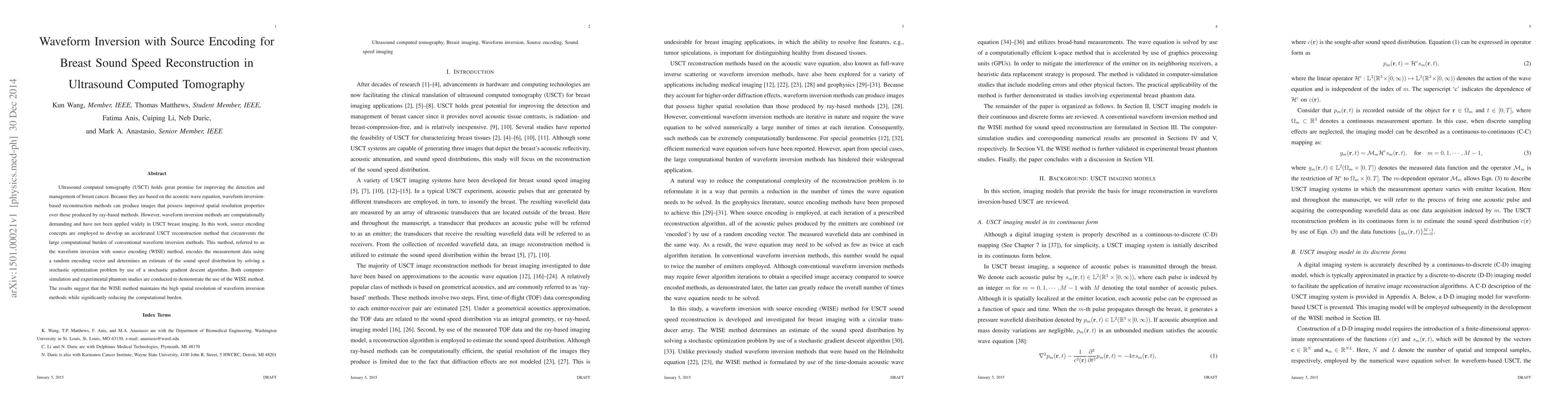 This paper proposes a waveform inversion with source encoding (WISE) method for ultrasound computed tomography (USCT) to reconstruct breast sound speed distributions with improved spatial resolution and reduced computational cost compared to traditional waveform inversion methods. The WISE method employs random encoding vectors and stochastic gradient descent to achieve these goals, validated by both simulation and phantom studies.