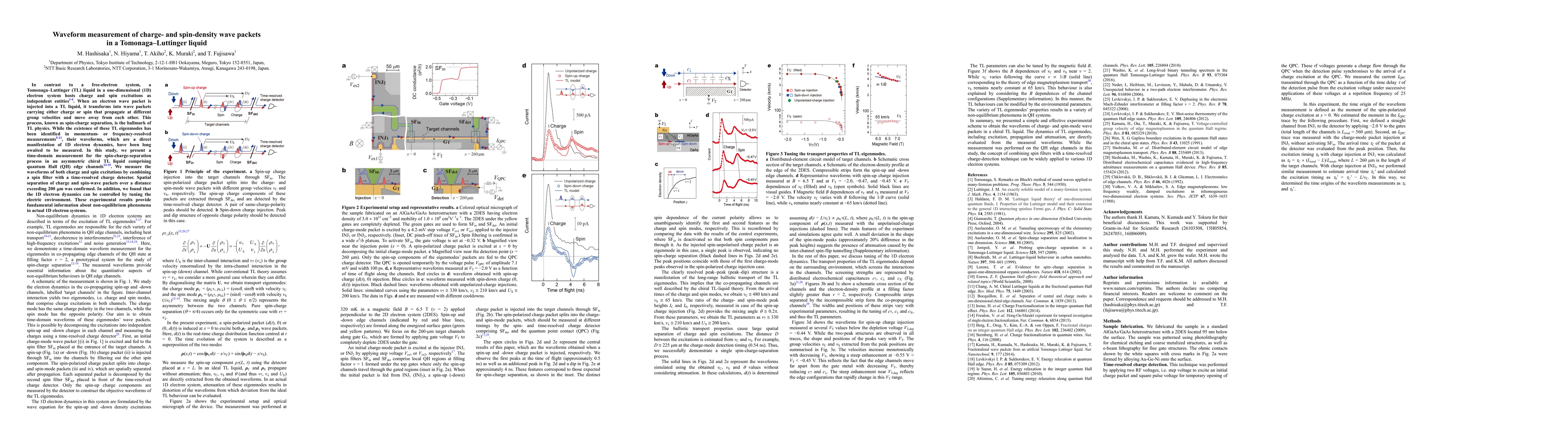 This study measures the waveforms of charge and spin excitations in a Tomonaga-Luttinger liquid, demonstrating spin-charge separation through time-domain analysis. The spatial separation of charge and spin wave packets confirms the distinct dynamics of 1D electron systems, with control over these dynamics achievable via electric environment tuning.